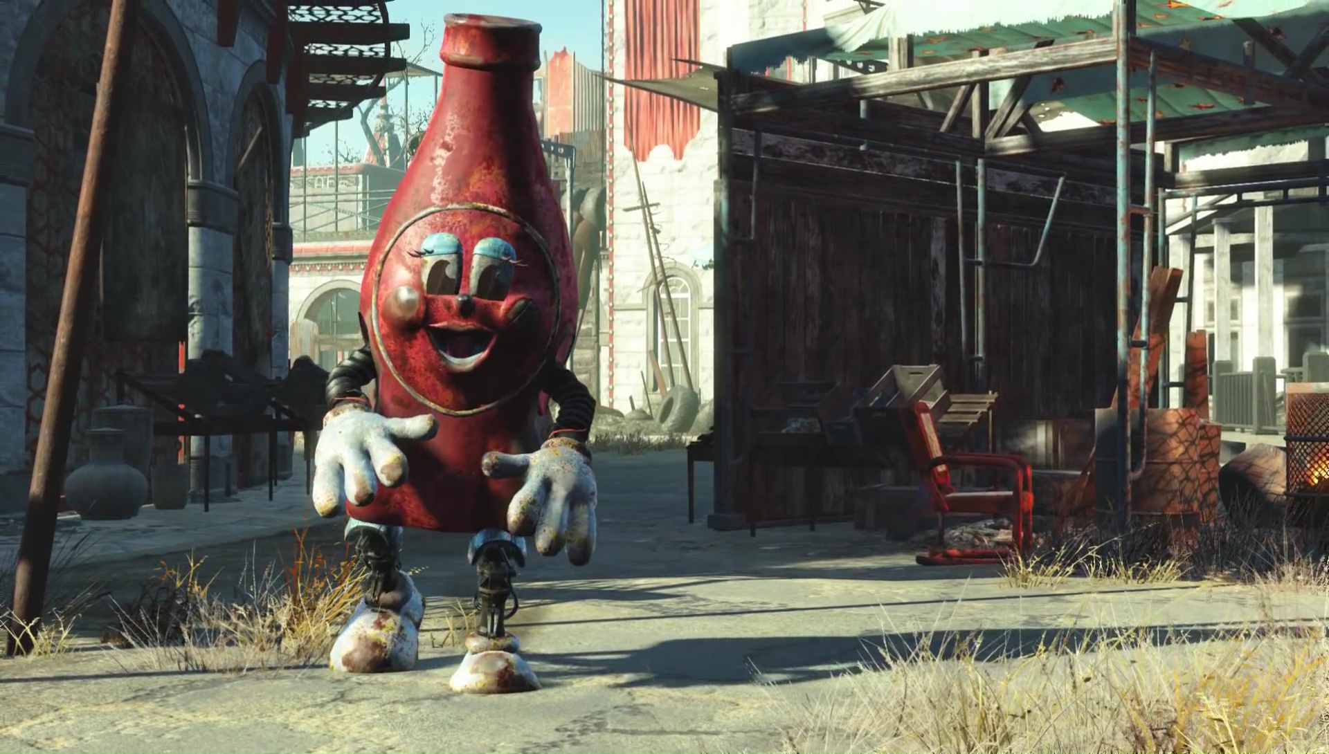 Description: A large red object standing in a street next to a building and a building with a sign on it.