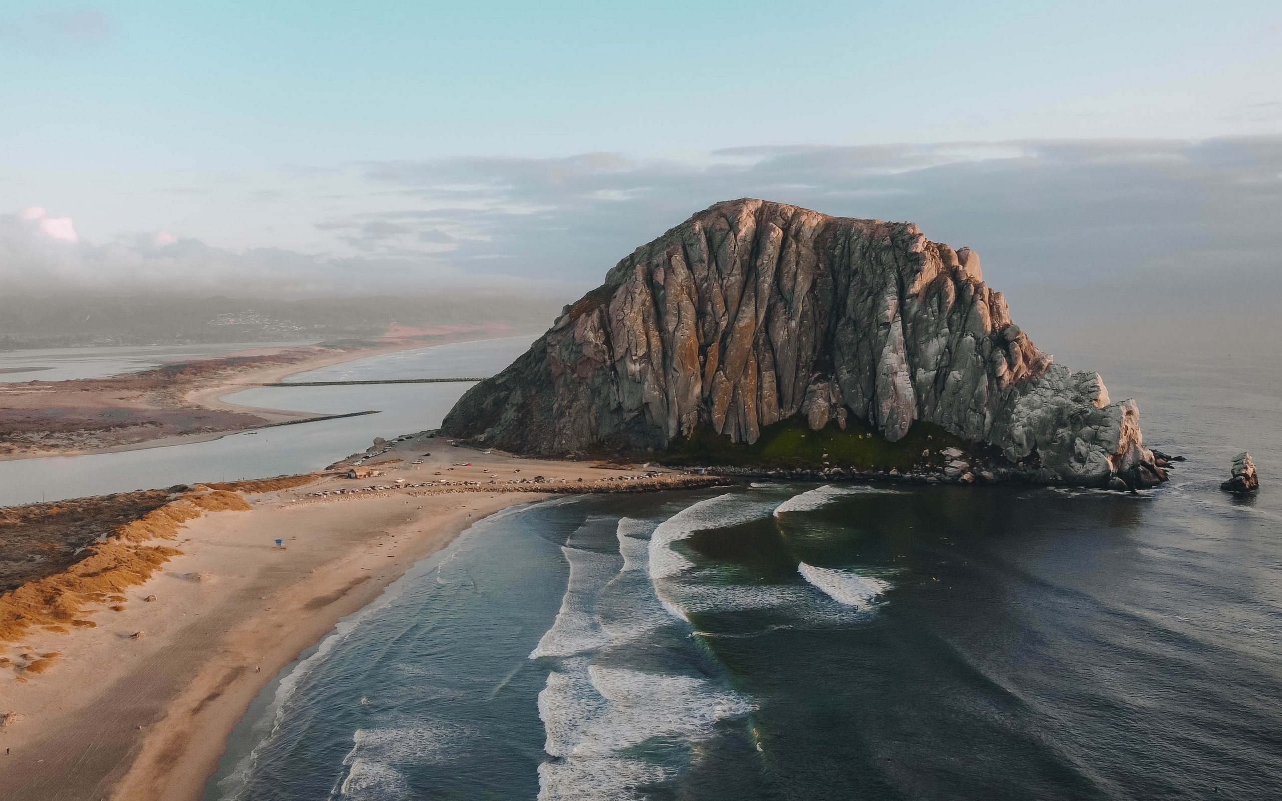Description: A large rock sitting on top of a beach next to the ocean with waves coming in to it and a boat in the water.