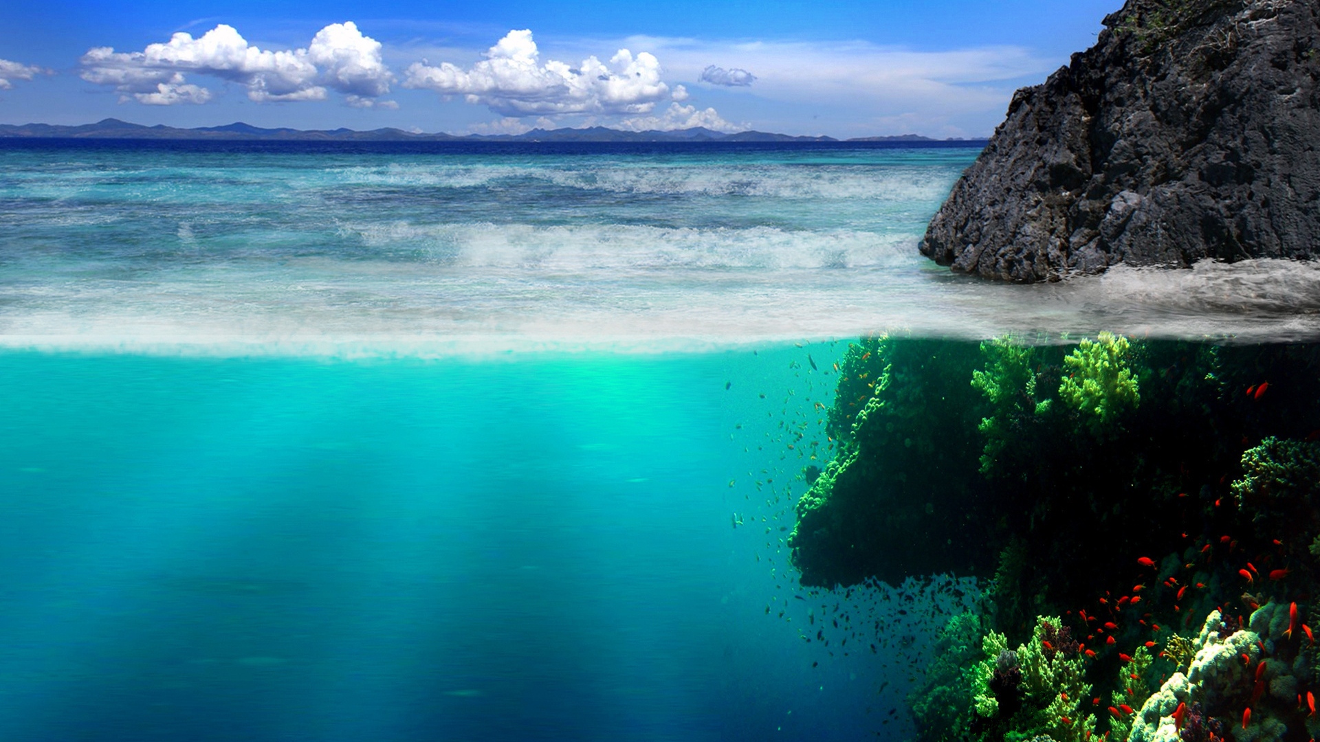 Description: A large rock sticking out of the ocean next to a coral reef with fish swimming around it and a rock out of the water.