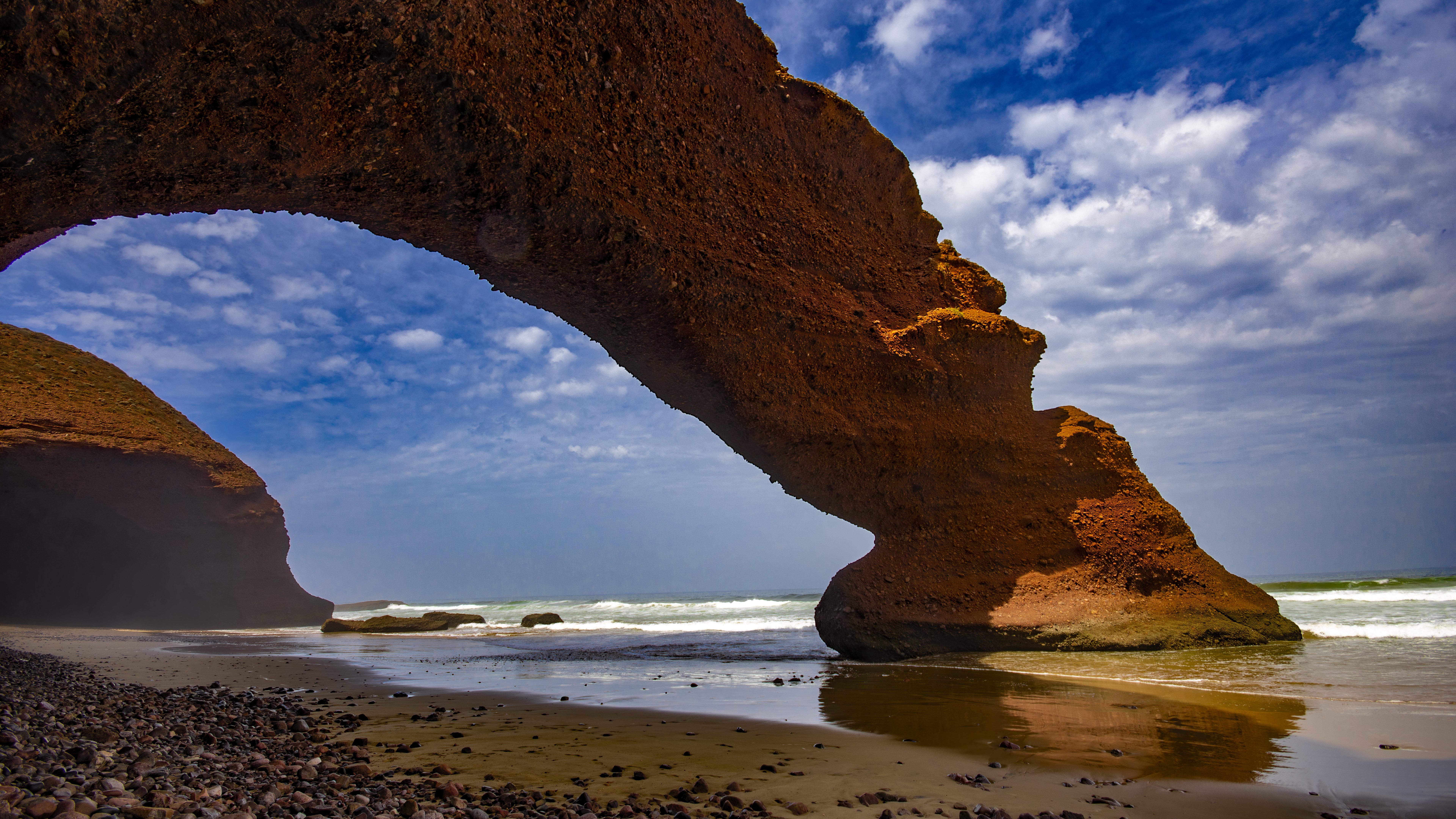 Description: A large rock formation on the beach with a sky background and water below it and a person walking on the beach.