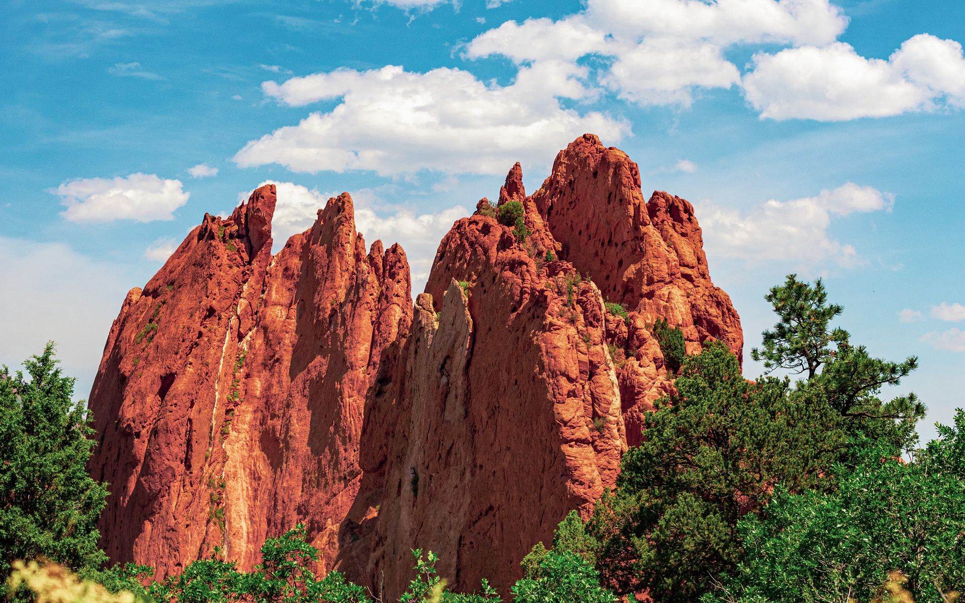 Description: A large rock formation in the middle of a forest area with trees around it and a blue sky with clouds.