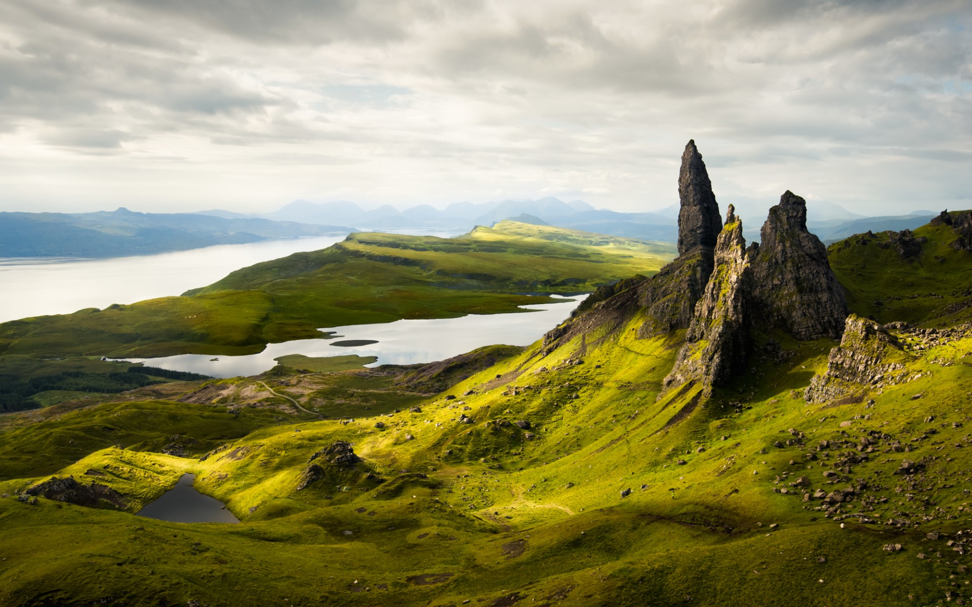 Description: A large rock formation on a grassy hill with a lake in the distance and mountains in the background with clouds in the sky.