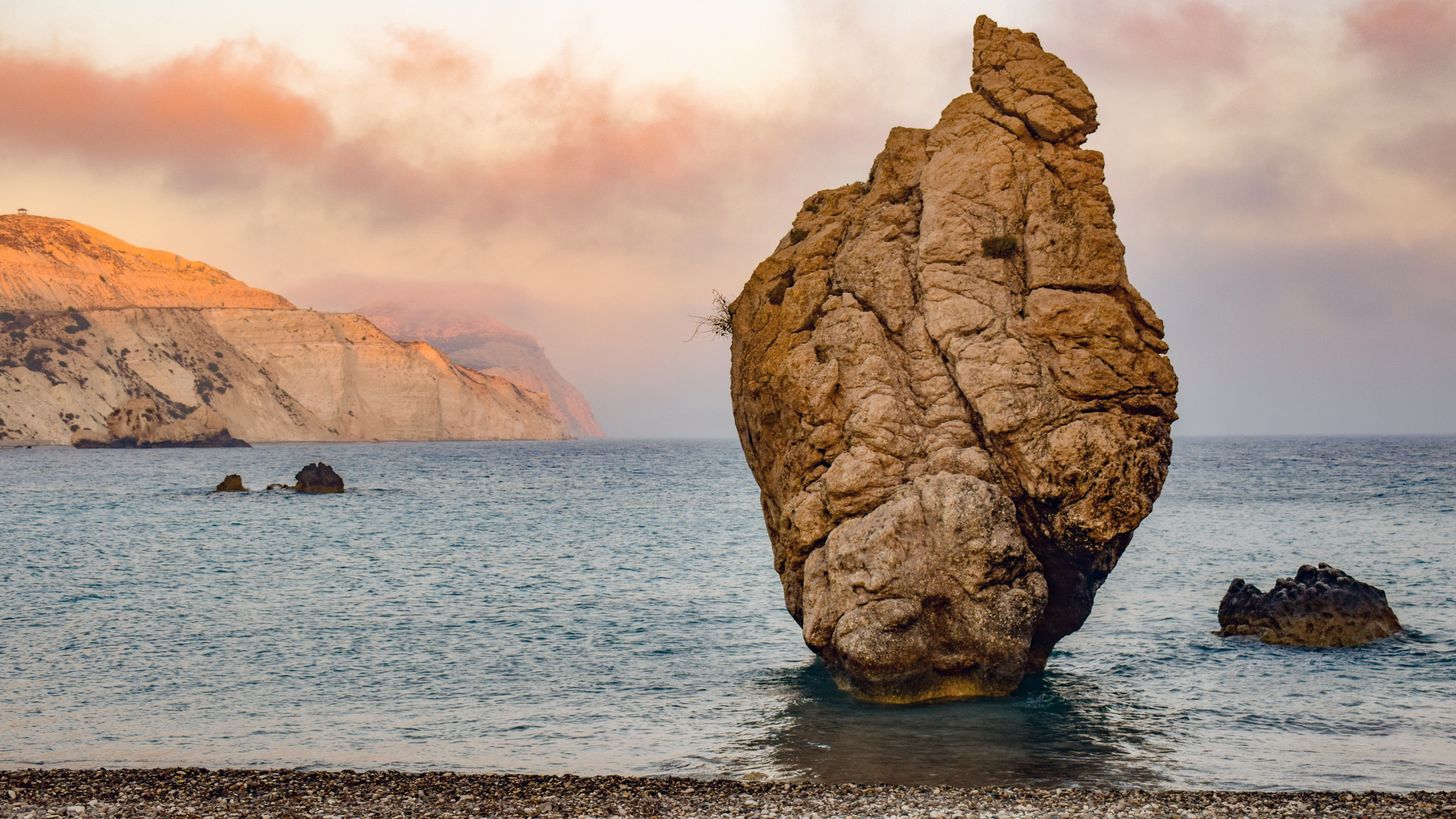 Description: A large rock sticking out of the ocean next to a beach with a rock formation in the water and a mountain in the background.