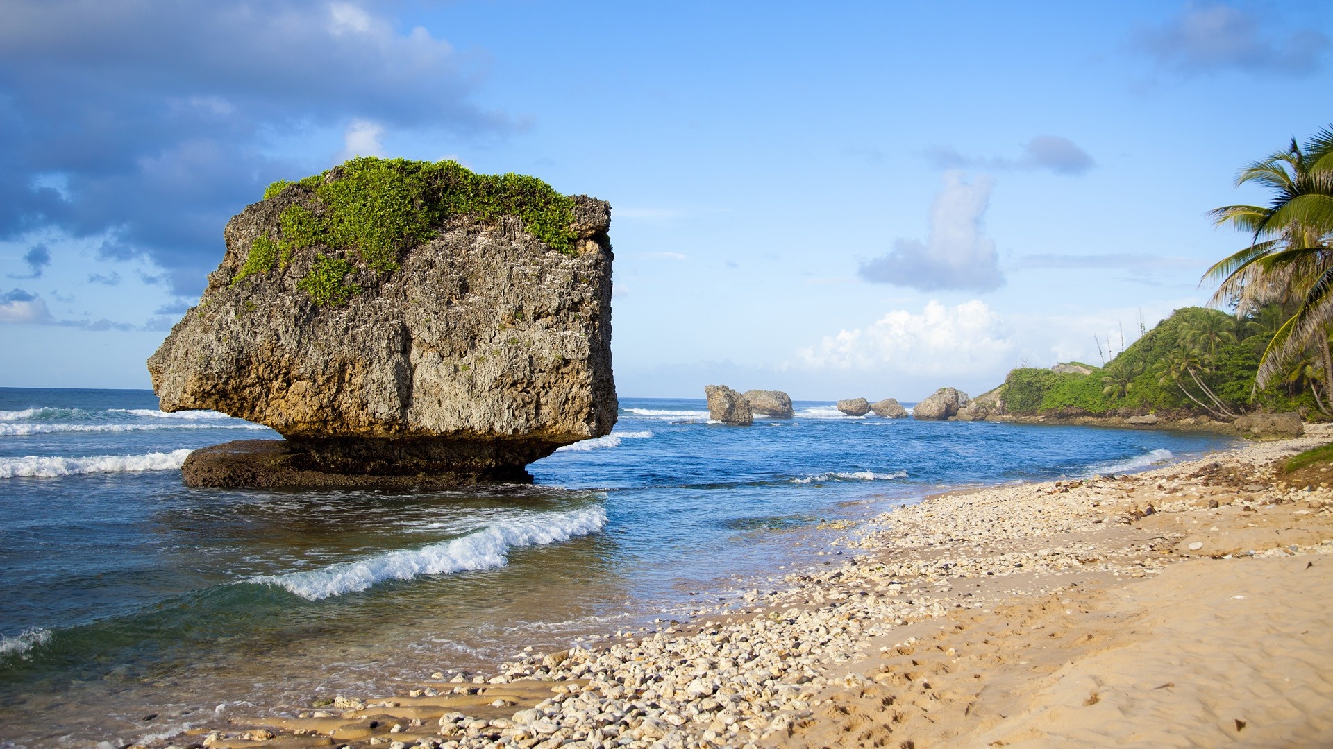 Description: A large rock sticking out of the ocean next to a beach with waves coming in and out of it.