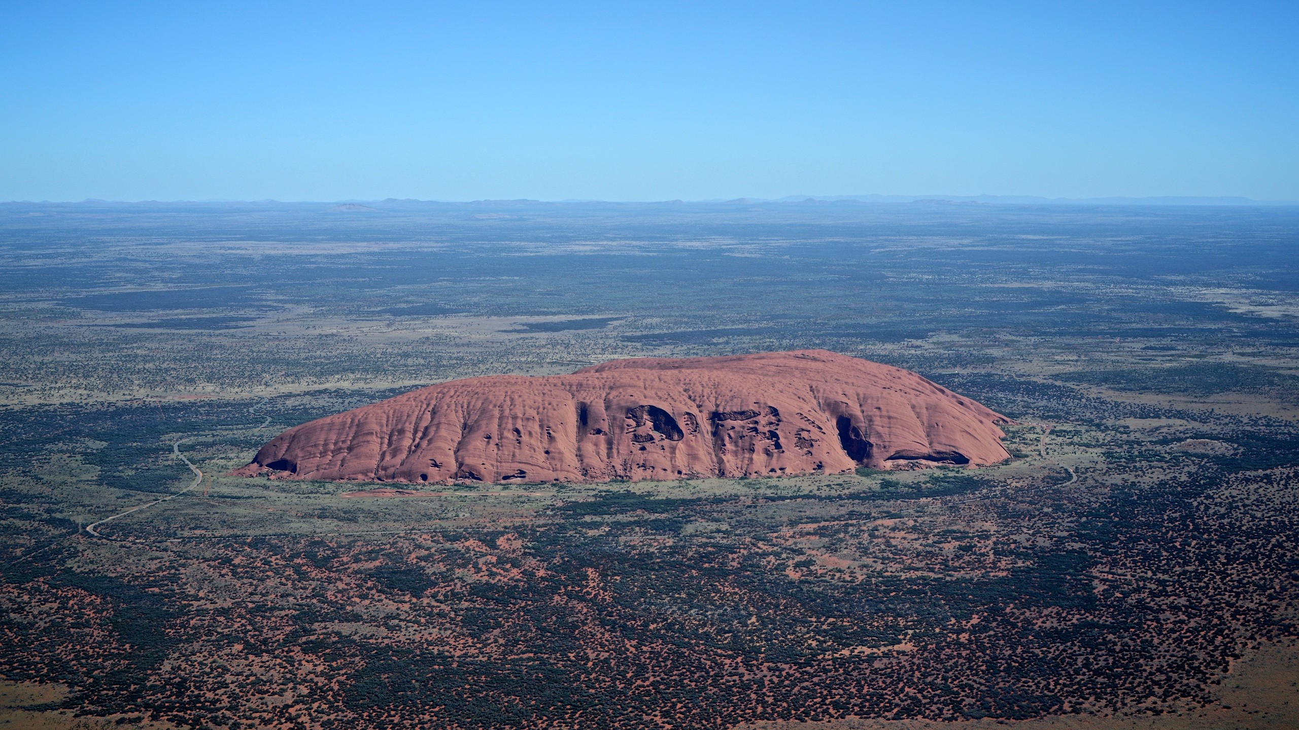 Description: A large rock in the middle of a plain with a sky background and a few clouds in the sky.