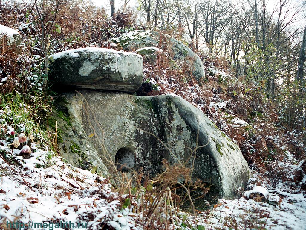 Description: A large rock sitting on top of a snow covered hillside next to trees and bushes covered in snow covered rocks.
