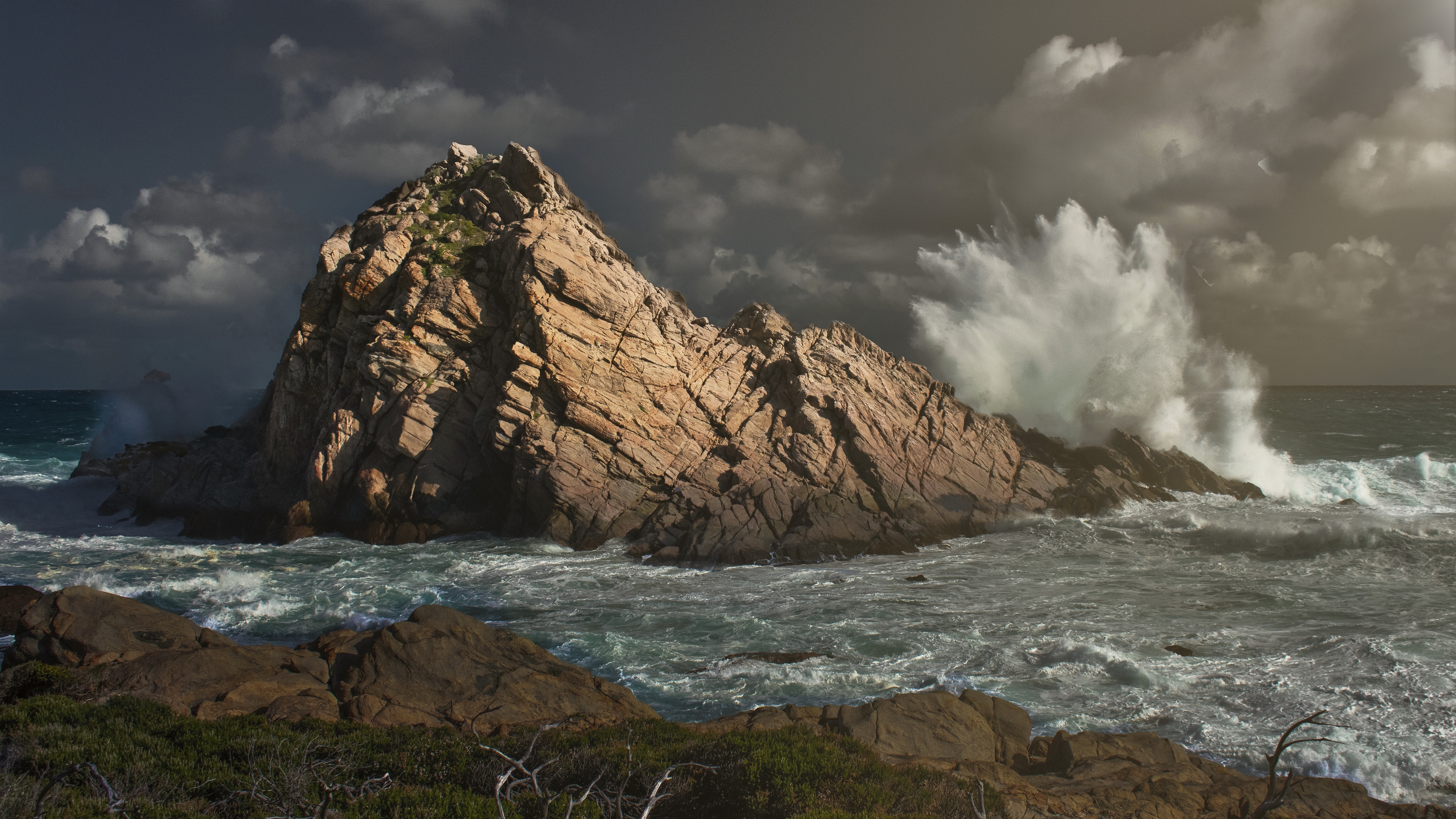 Description: A large rock with a wave crashing over it on the ocean shore with a cloudy sky above it and a body of water below.