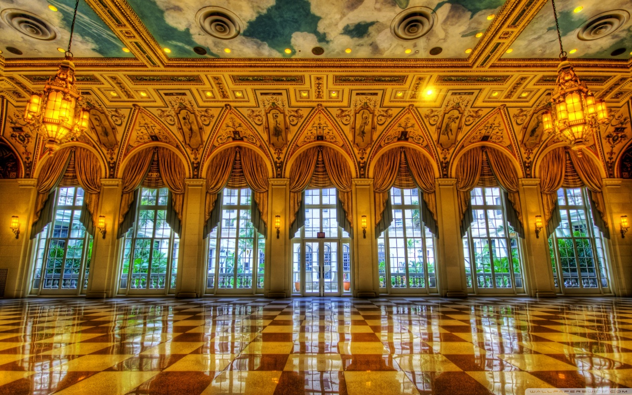 Description: A large room with a checkered floor and a ceiling with windows and a sky painted on the ceiling.