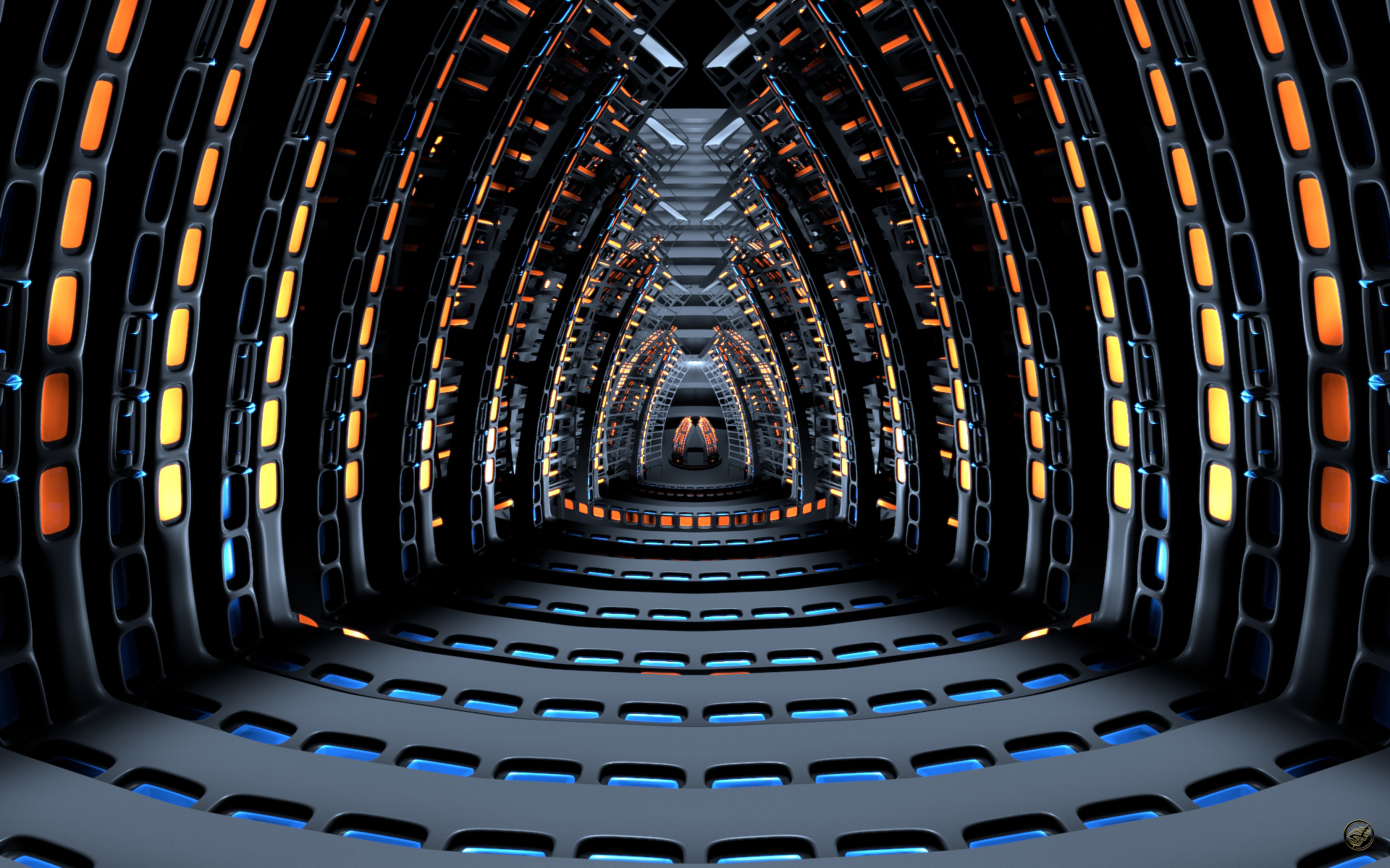 Description: A very large room with a very long corridor of lights and a person walking through it in the middle.