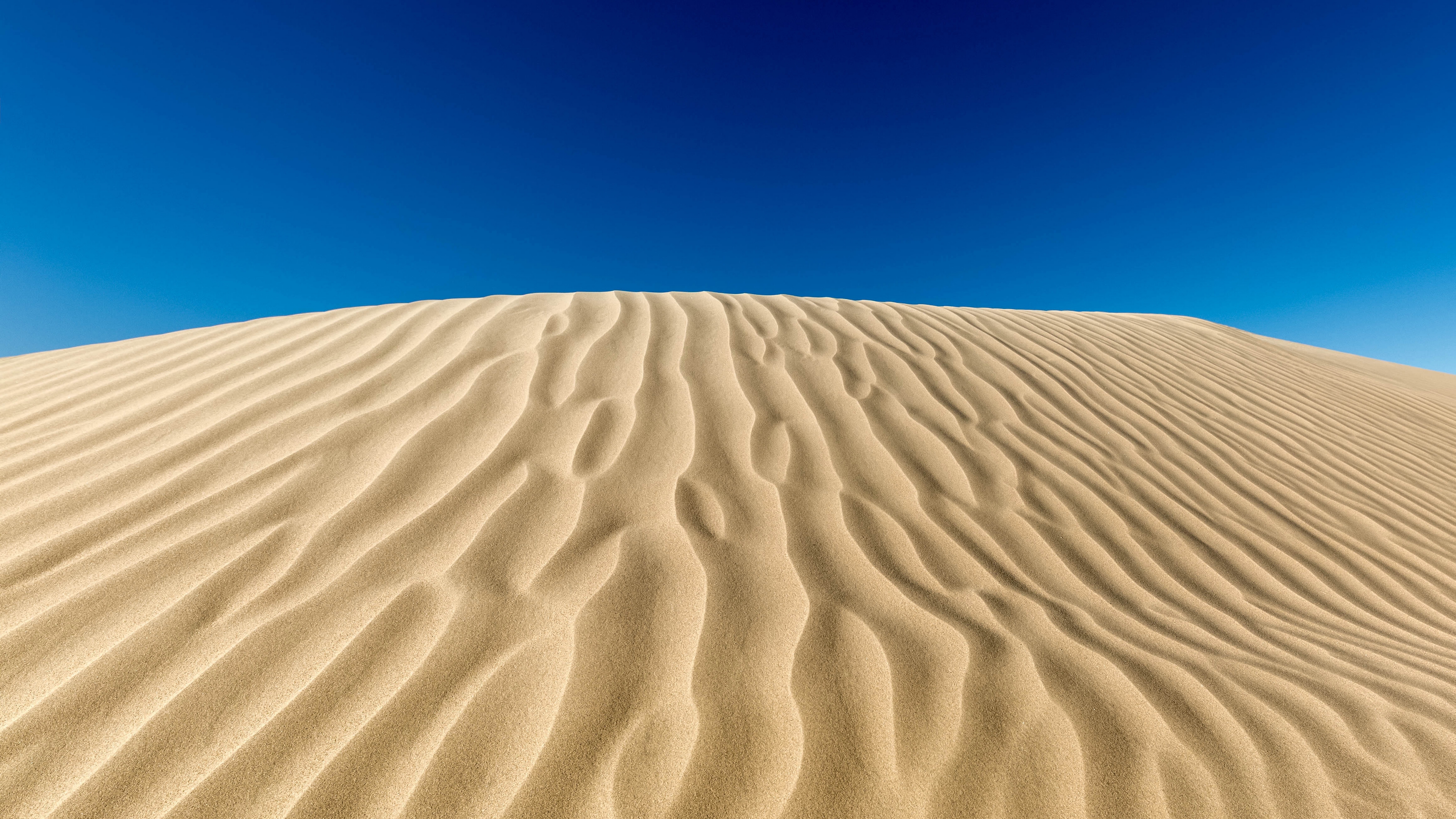 Description: A large sand dune with a blue sky in the background and a few clouds in the sky above it.