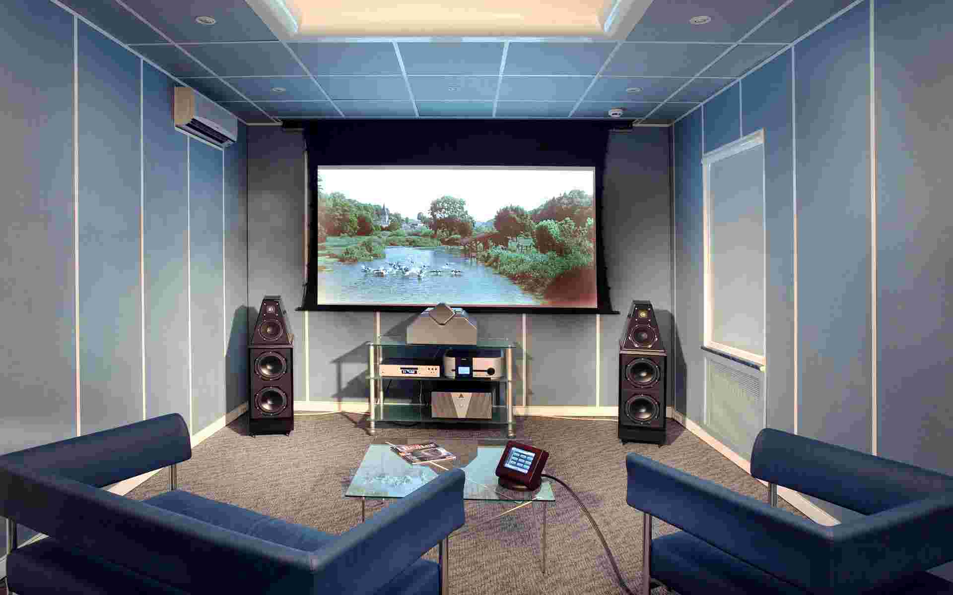 Description: A room with a large screen and two chairs in it and a table with a phone on it and a remote control.