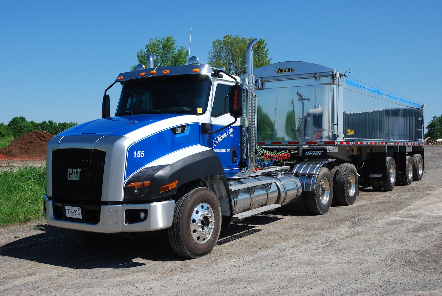 Description: A large semi truck is parked on a dirt road near a field and trees.