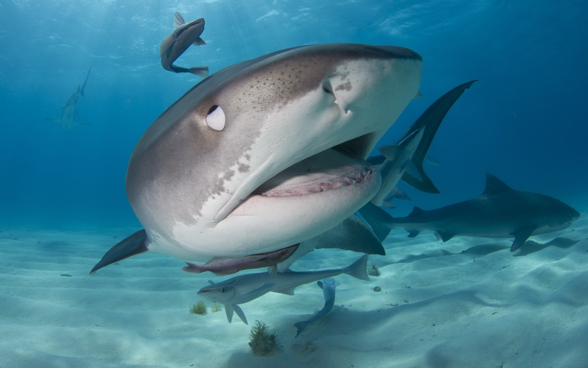 Description: A large shark with a large mouth and a few fish around it's neck in the water with a sunbeam.