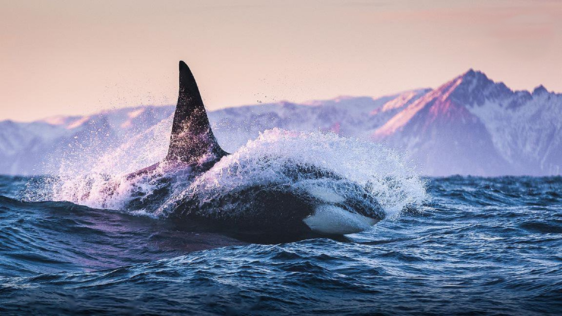Description: A large shark is in the water with mountains in the background in the ocean with a pink sky and a pink sky.