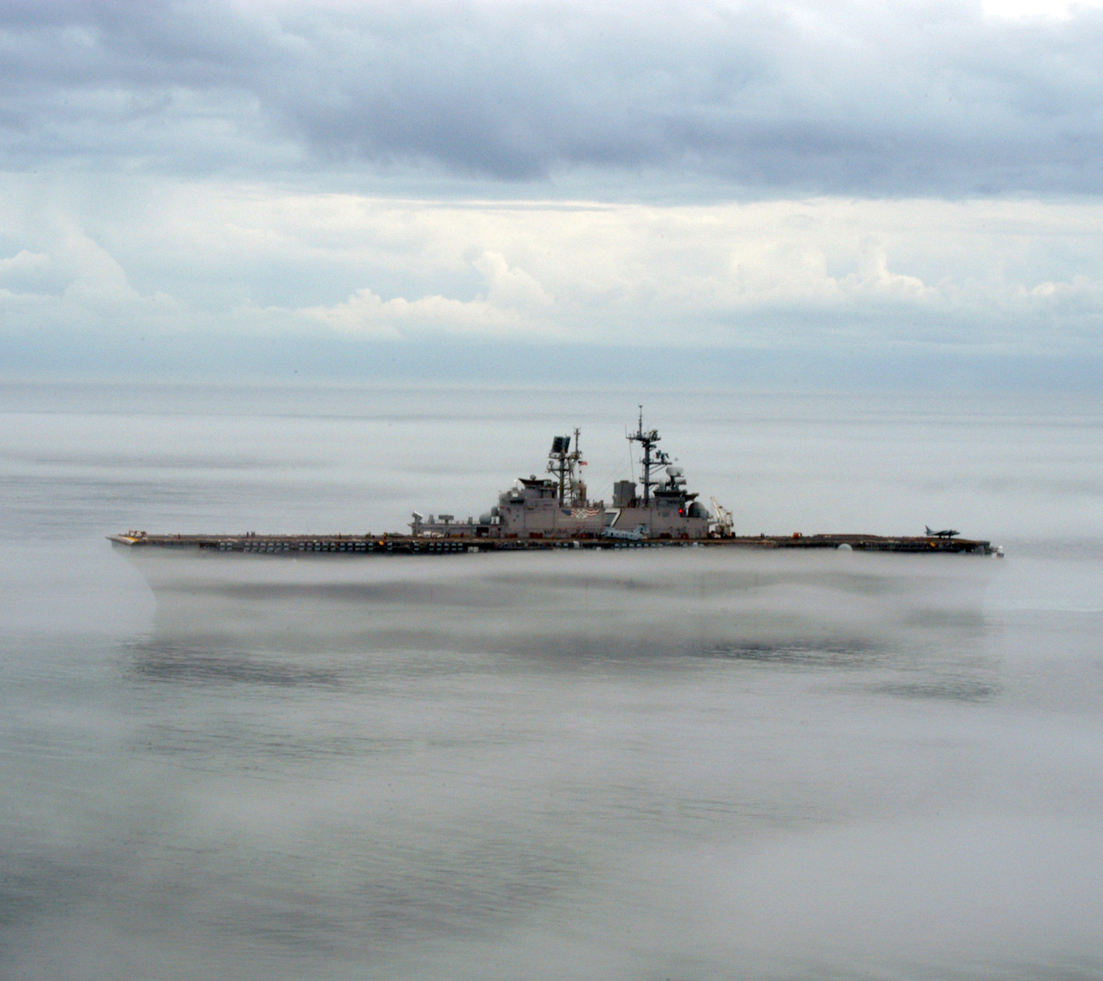 Description: A large ship floating on top of a body of water under a cloudy sky with clouds above it and a smaller ship in the distance.