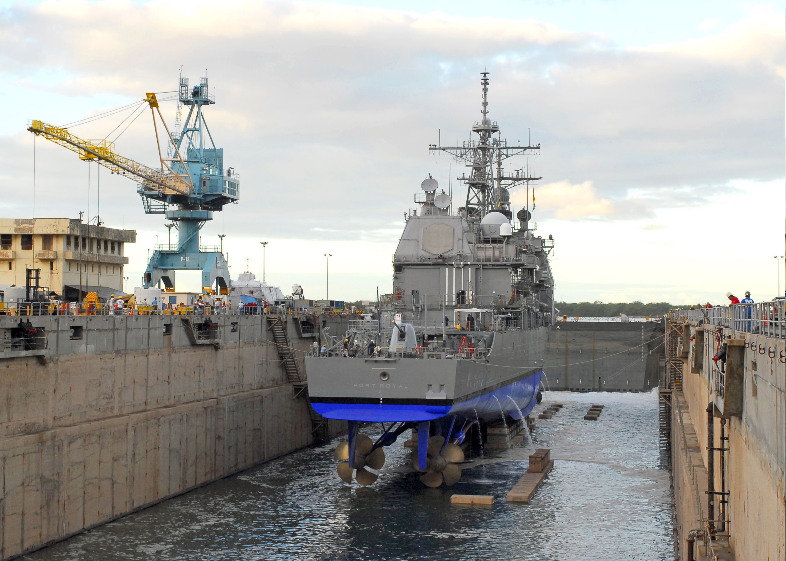 Description: A large ship is docked at a dock with a crane nearby and a crane on the dock with a crane on the dock.