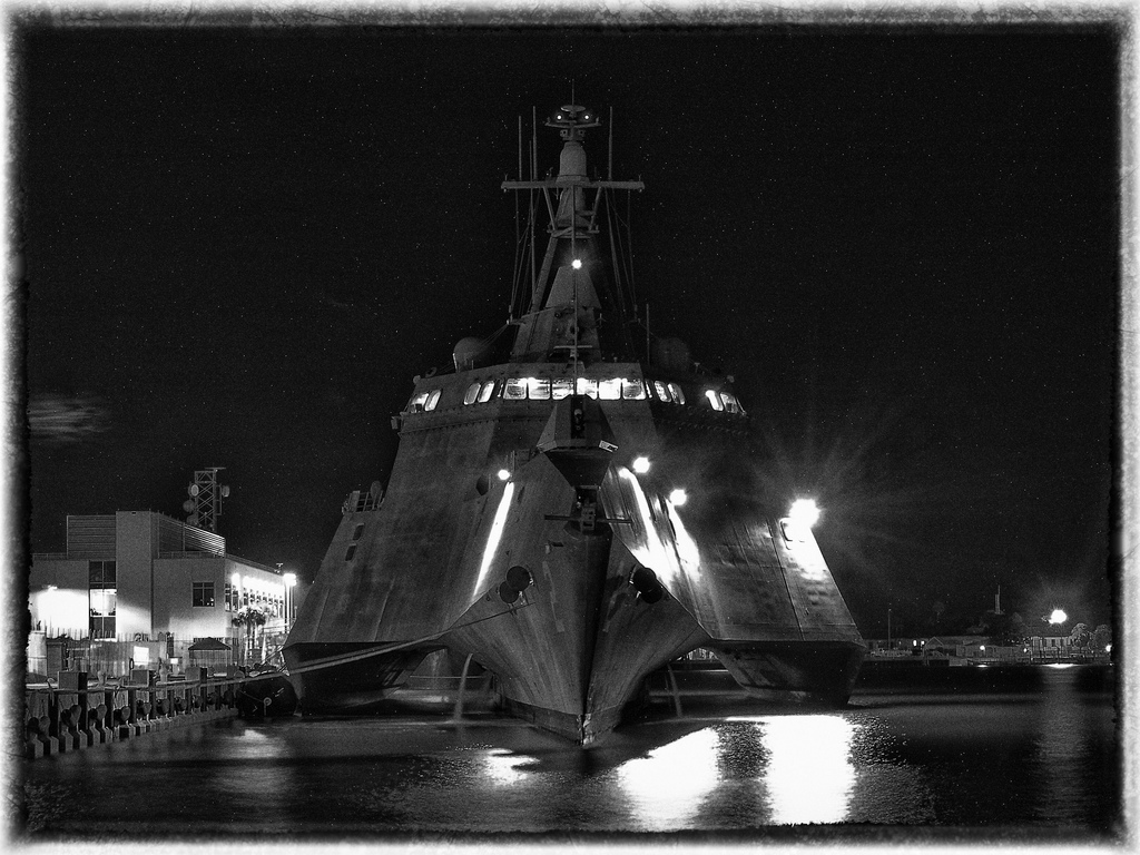Description: A large ship docked at a dock at night time with lights on it's hulls and lights on the side of the ship.
