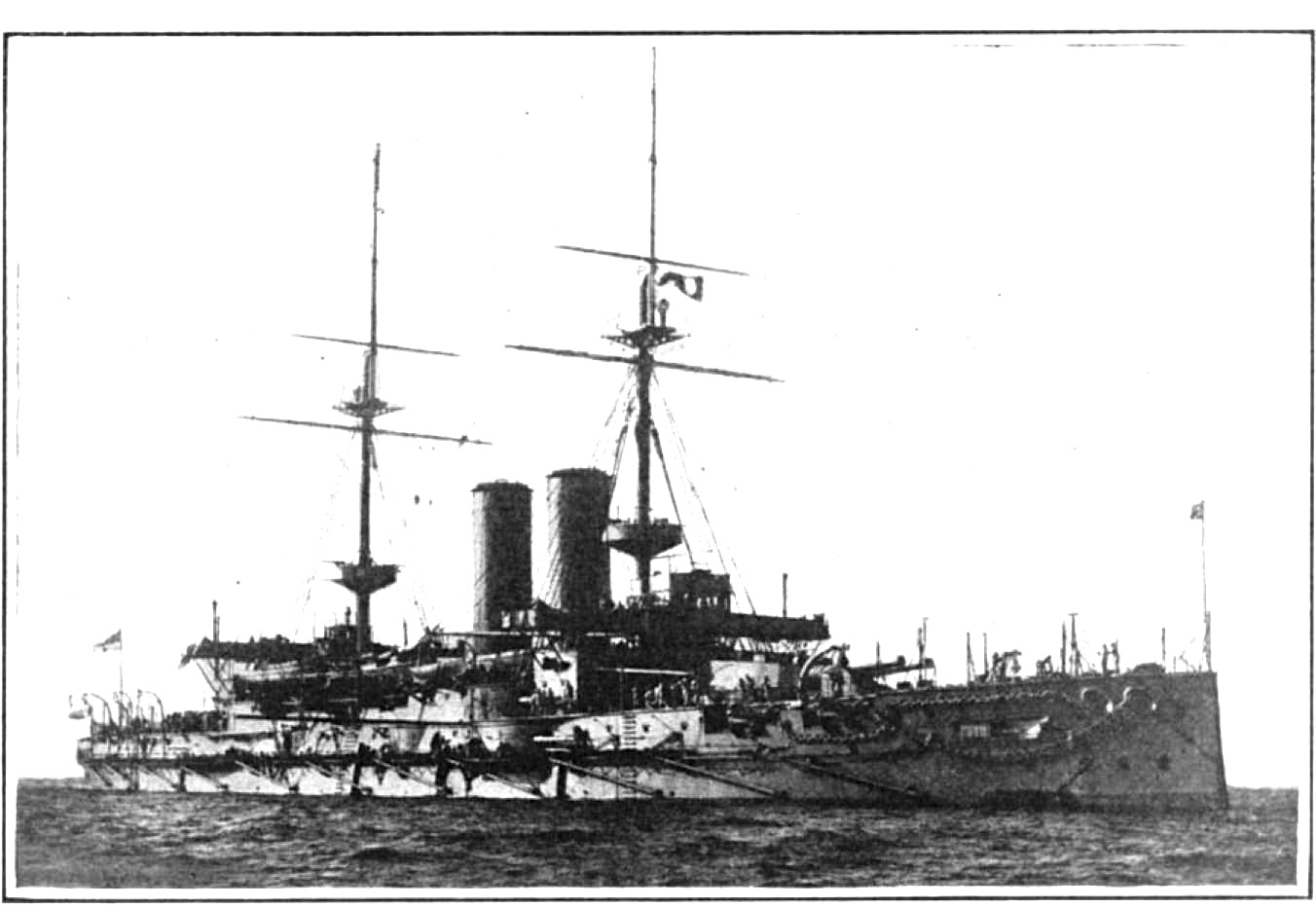 Description: A large ship floating on top of a body of water with a sky background and a few people standing on the deck.