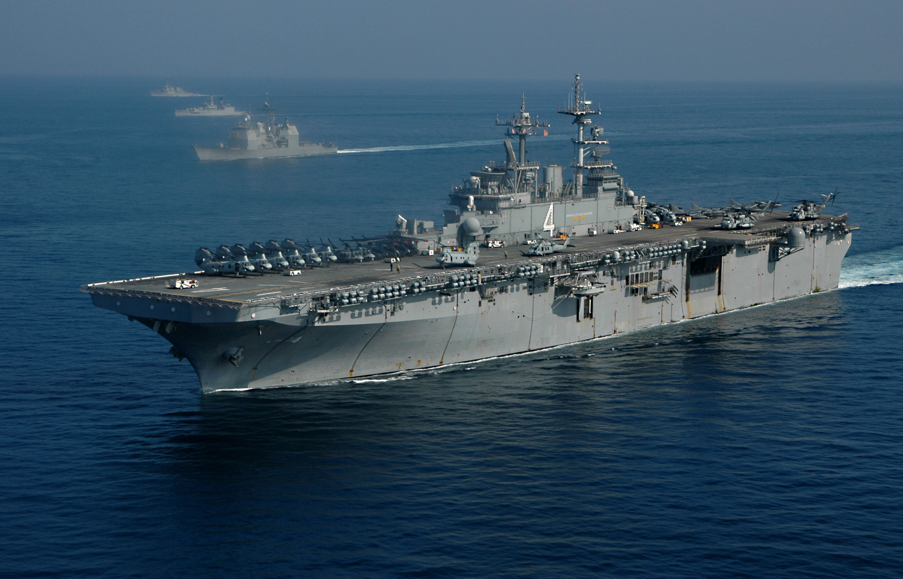 Description: A large ship in the middle of the ocean with another ship in the background in the water.