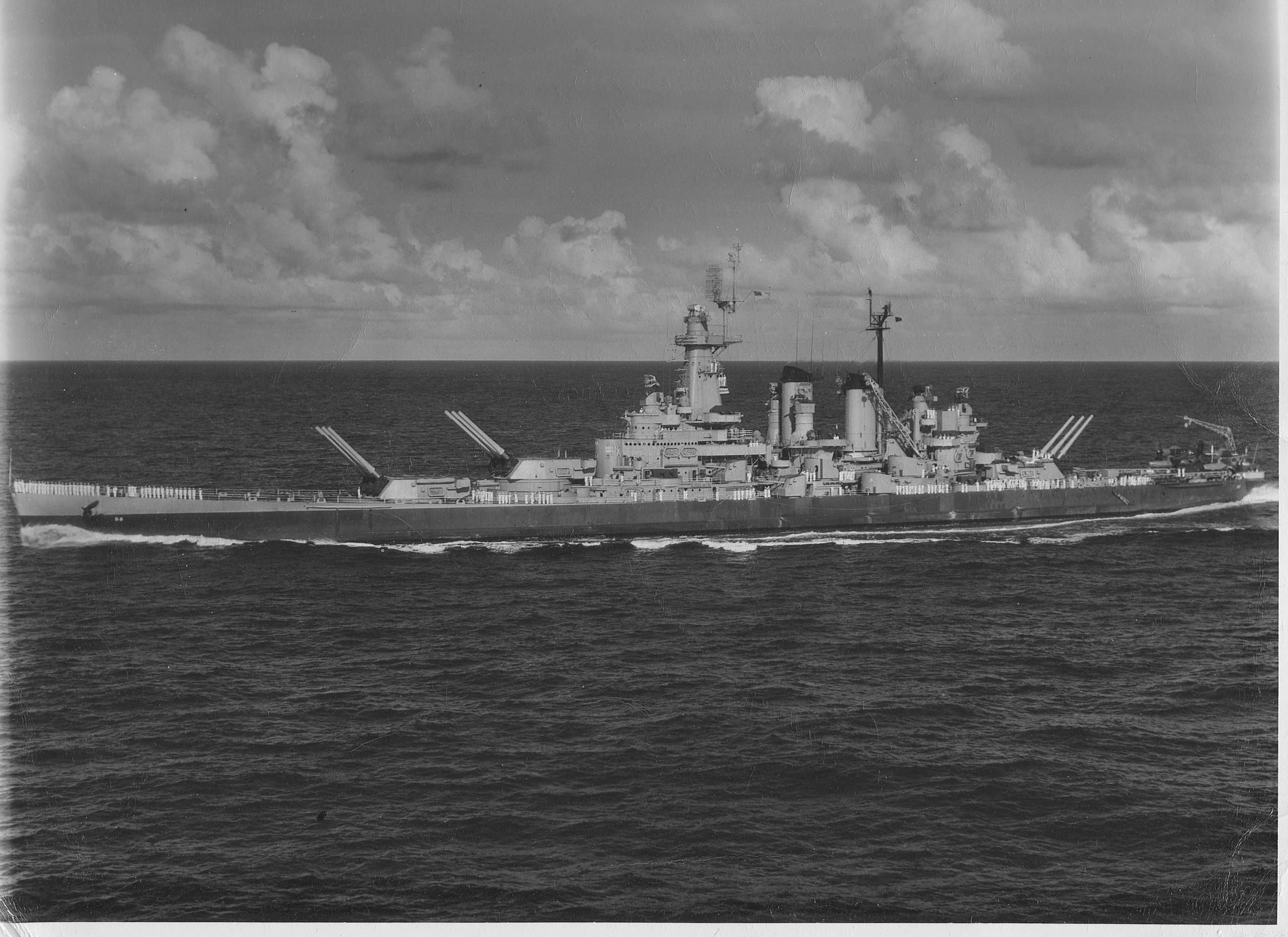 Description: A large ship in the middle of the ocean with clouds in the sky above it and a smaller boat in the water below it.