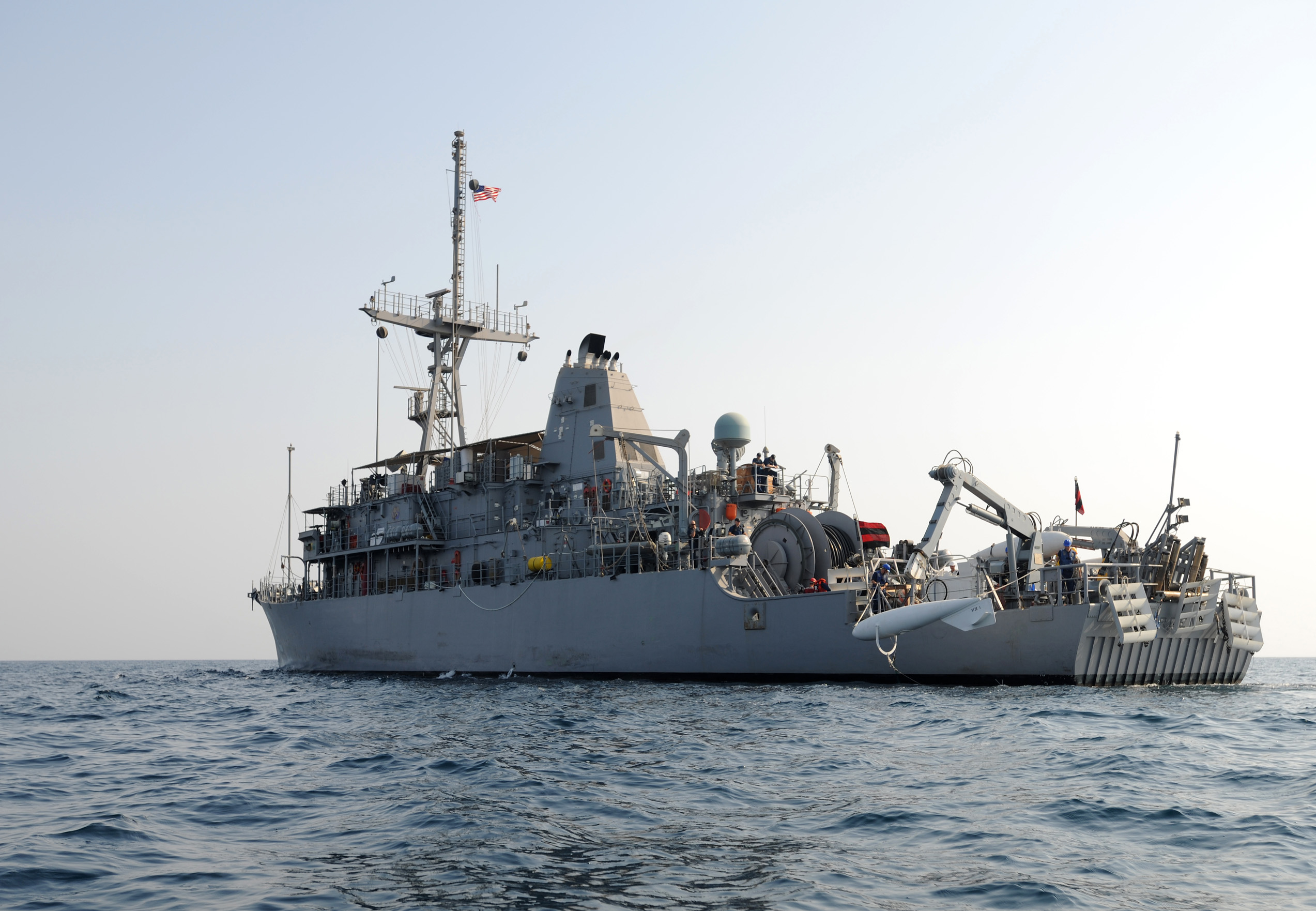 Description: A large ship in the middle of the ocean with a flag on it's mast and a flag on the front of it.