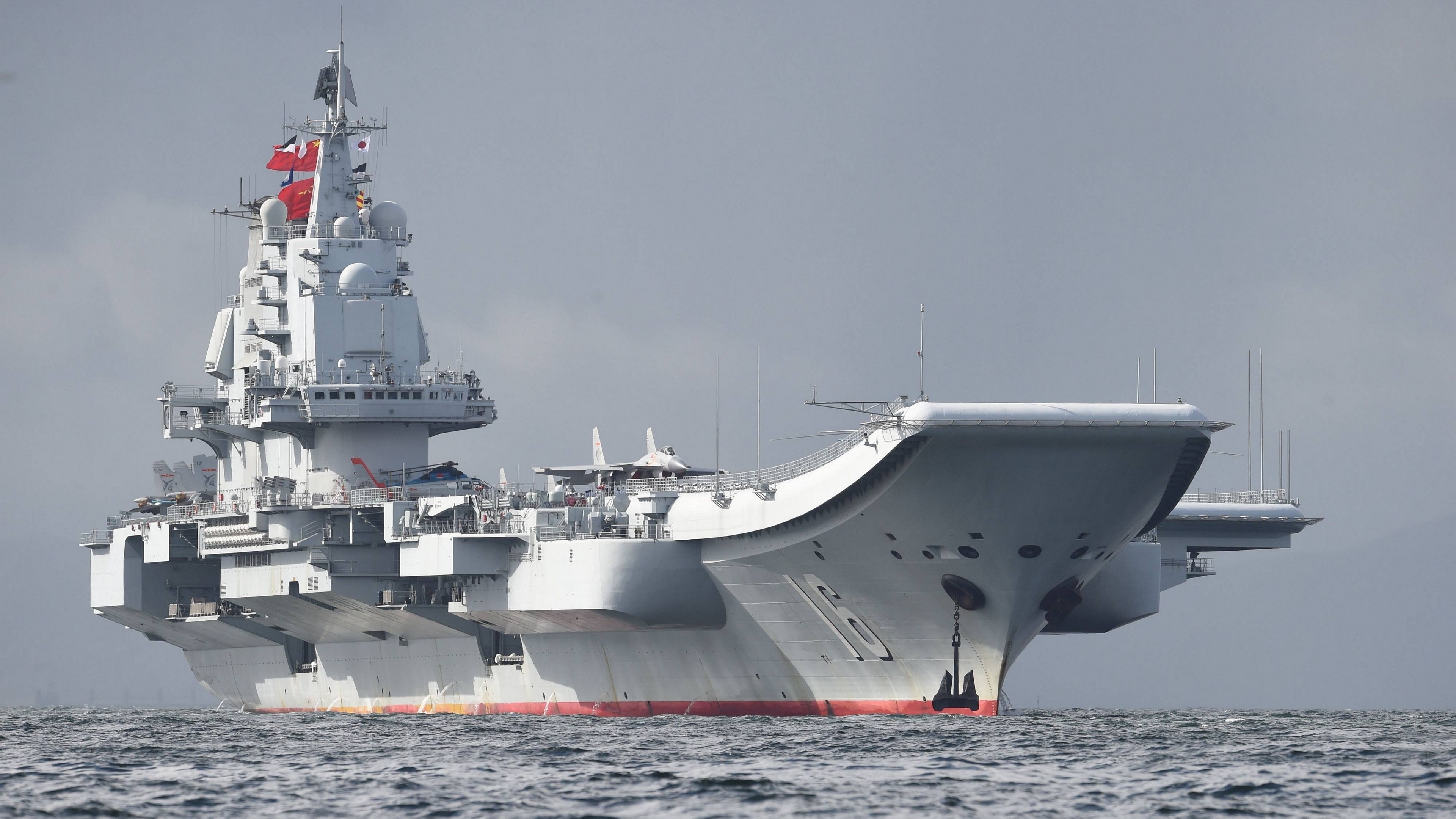 Description: A large ship in the middle of the ocean with a flag on it's mast and a smaller ship in the background.