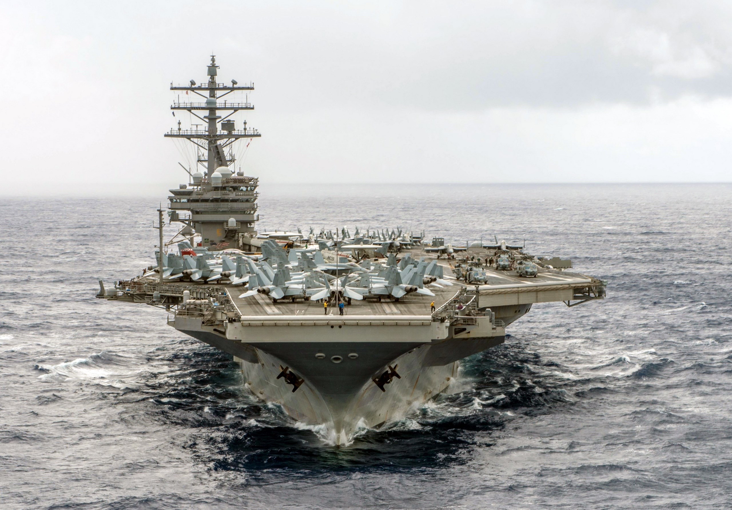Description: A large ship in the middle of the ocean with many jets on it's deck and a few people on the deck.