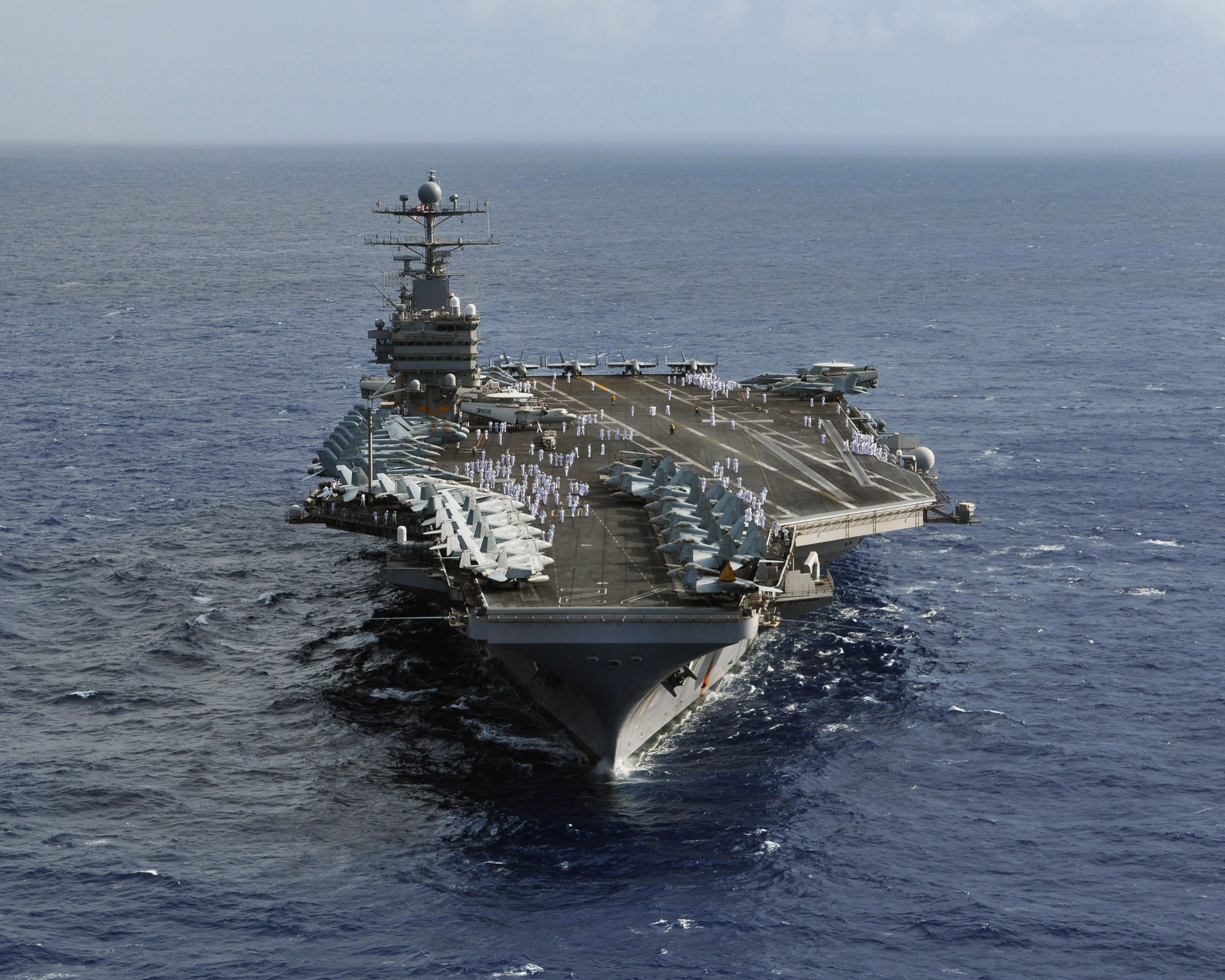 Description: A large ship in the middle of the ocean with a lot of people on it's deck and a lot of other boats.