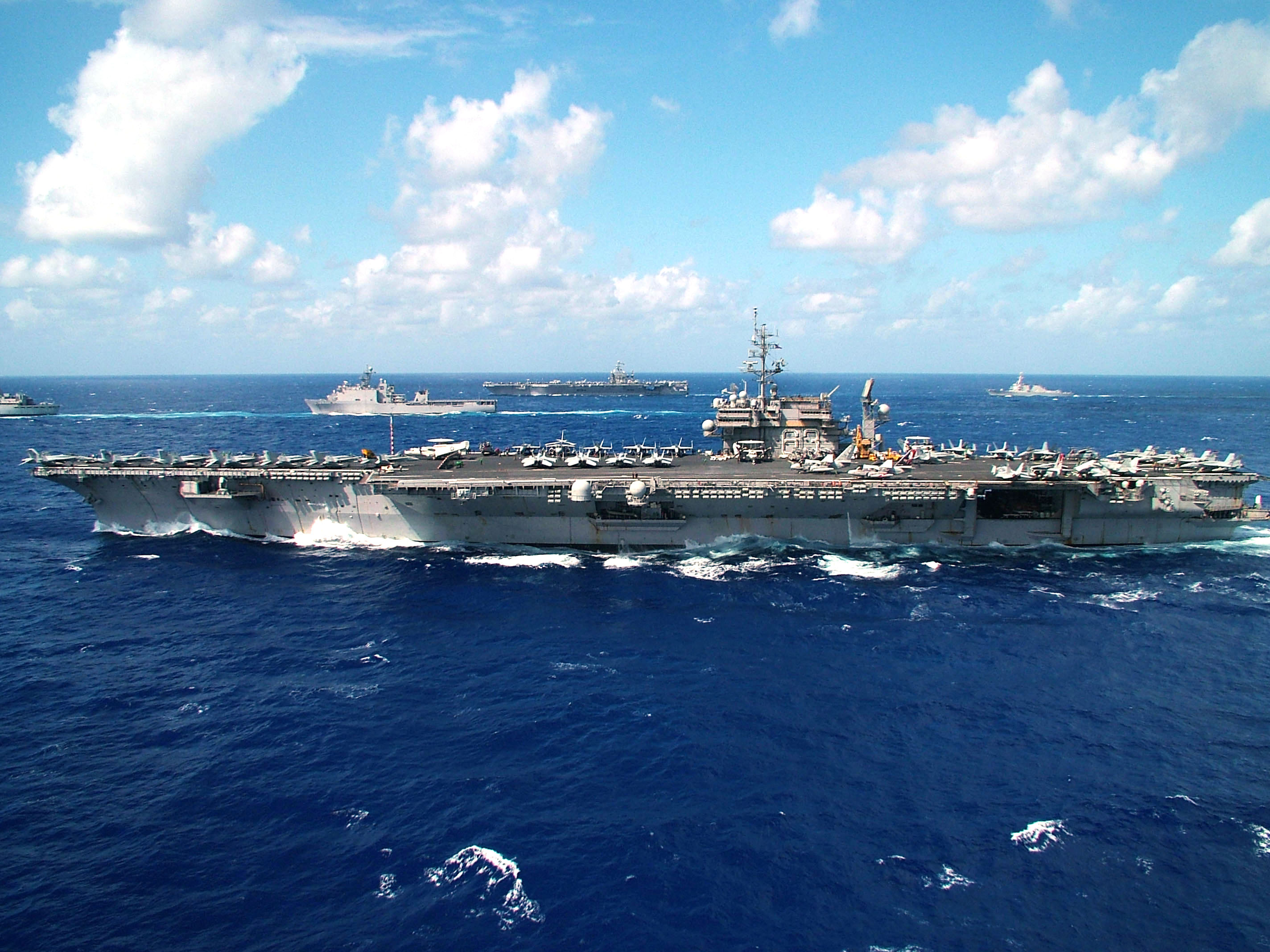 Description: A large ship in the middle of the ocean with other ships in the background on a sunny day with blue skies.