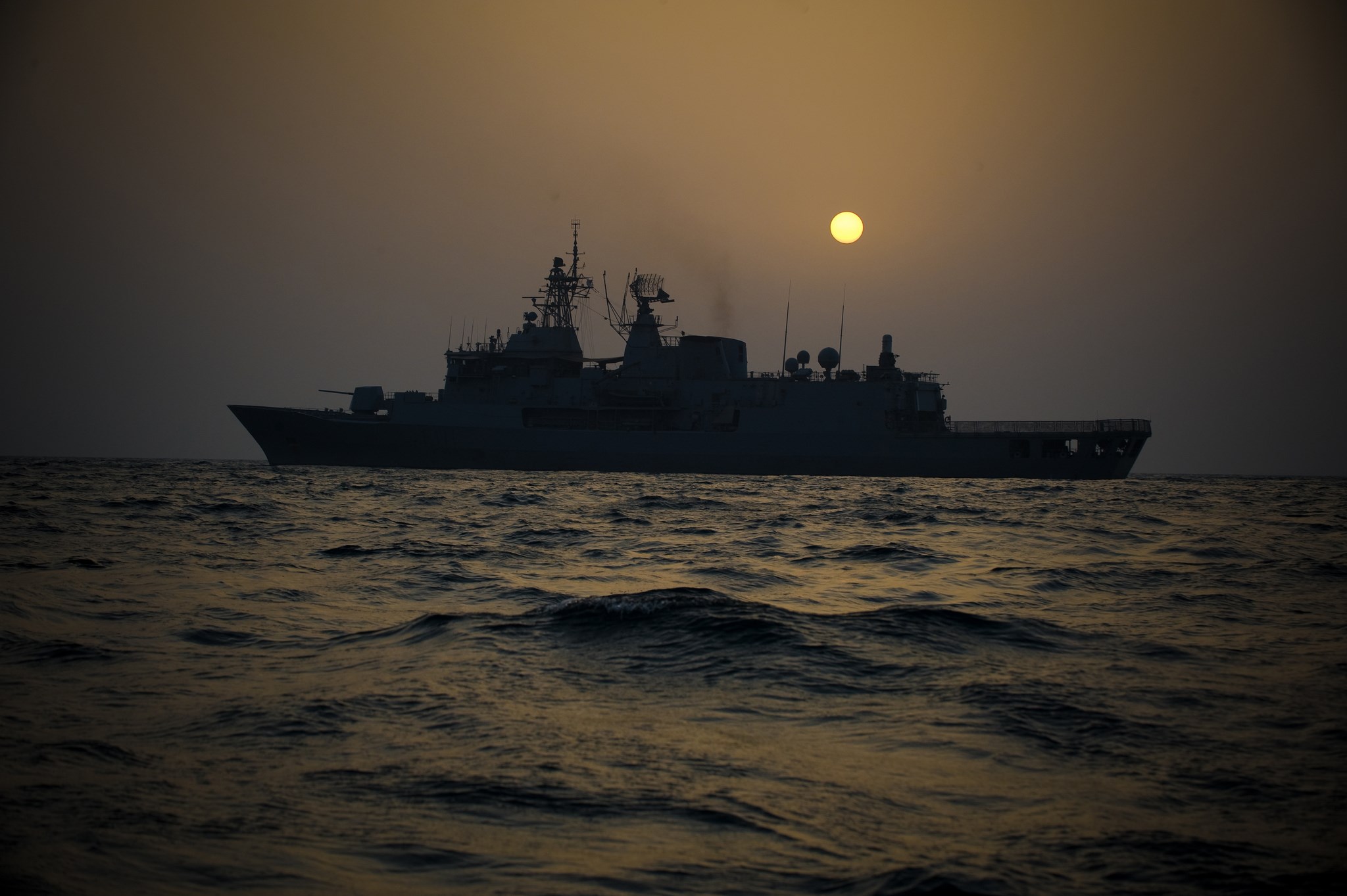 Description: A large ship in the ocean at sunset with a sun in the background and a hazy sky above it.