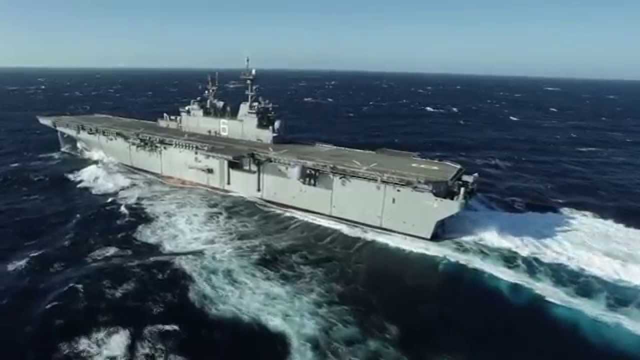 Description: A large ship in the middle of the ocean with waves around it and a smaller boat in the distance.