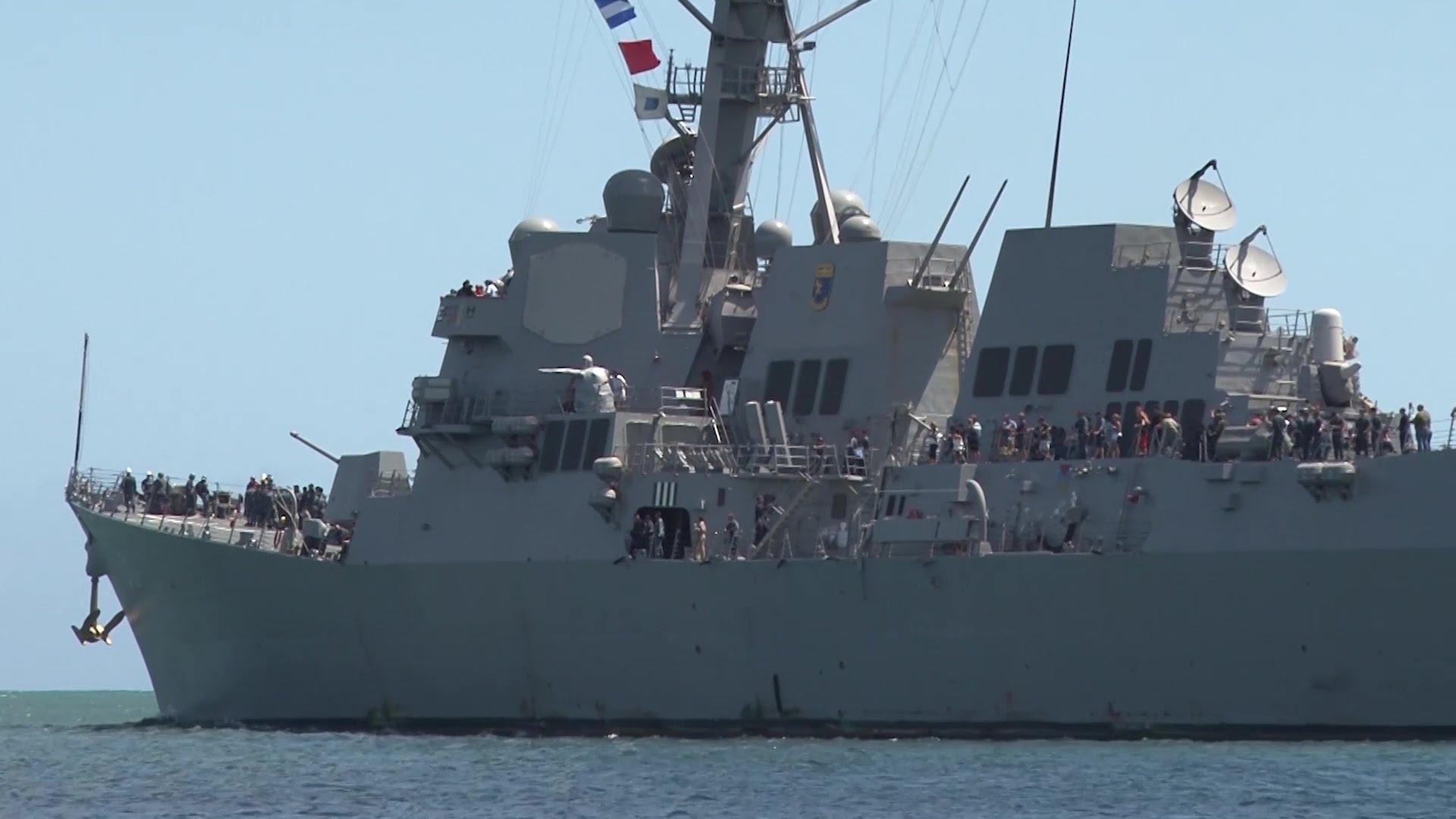Description: A large ship with a lot of people on it in the water near a beach and a flag pole.