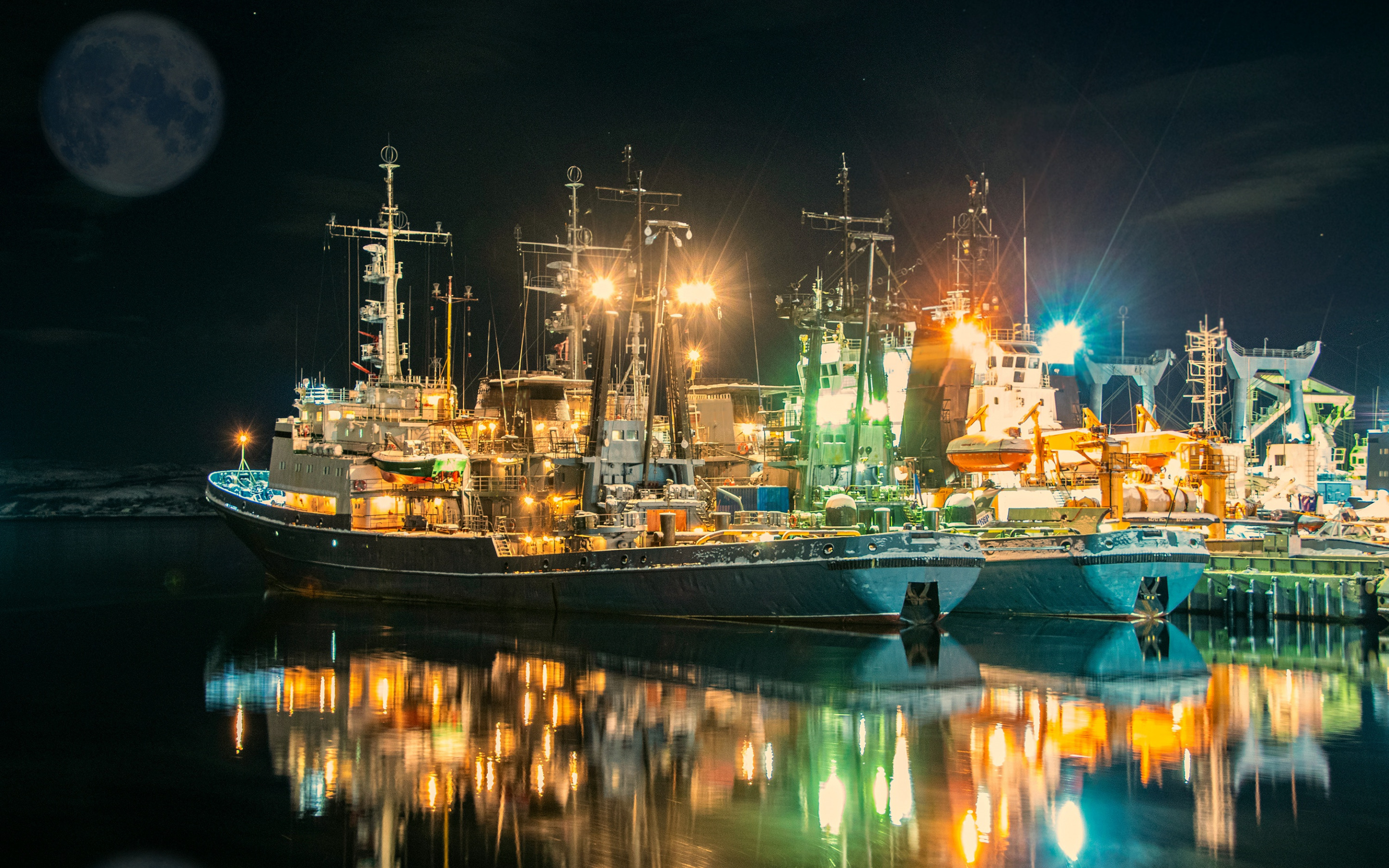 Description: A large ship docked at a pier at night time with a full moon in the background and a full moon in the sky.