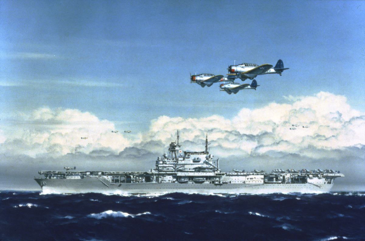 Description: A large ship with two planes flying over it in the sky above the ocean and a smaller plane flying over it.