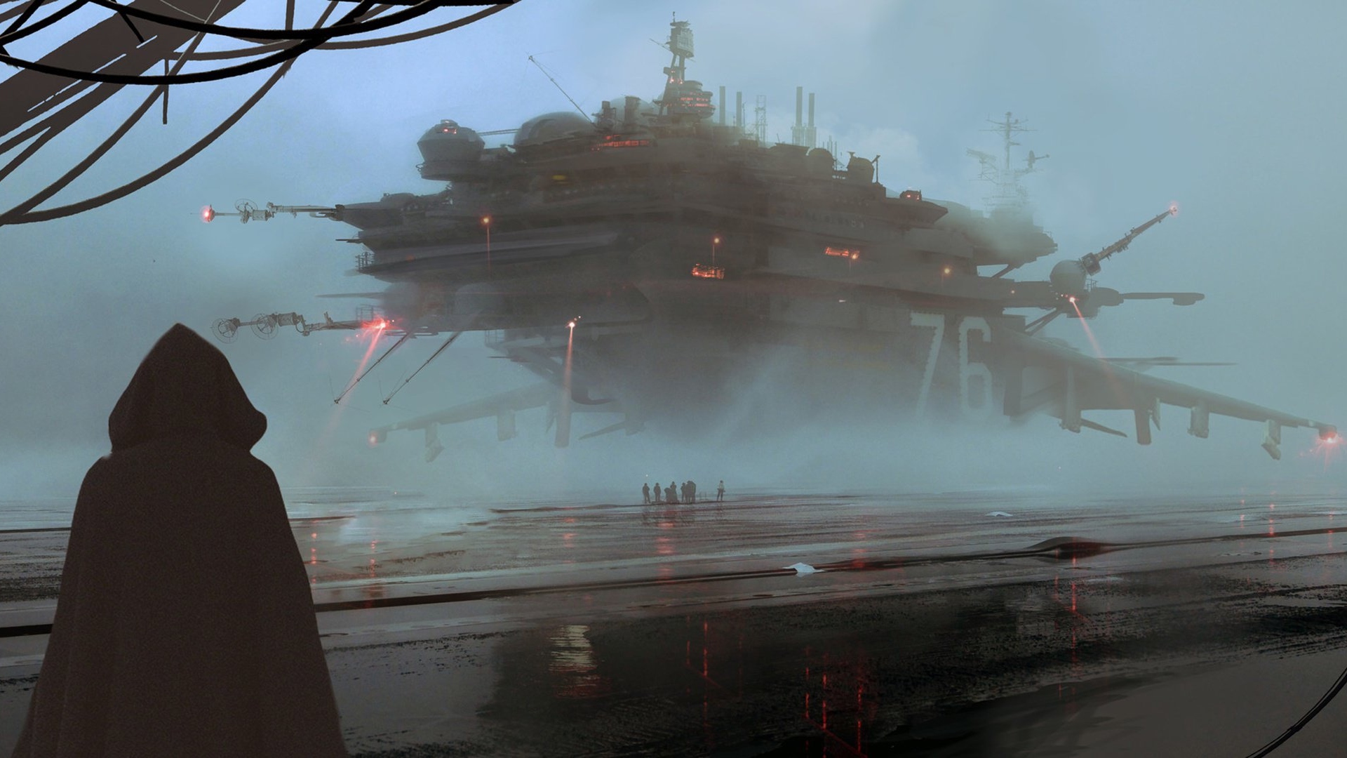 Description: A large ship floating on top of a body of water next to a shore line with a person standing next to it.