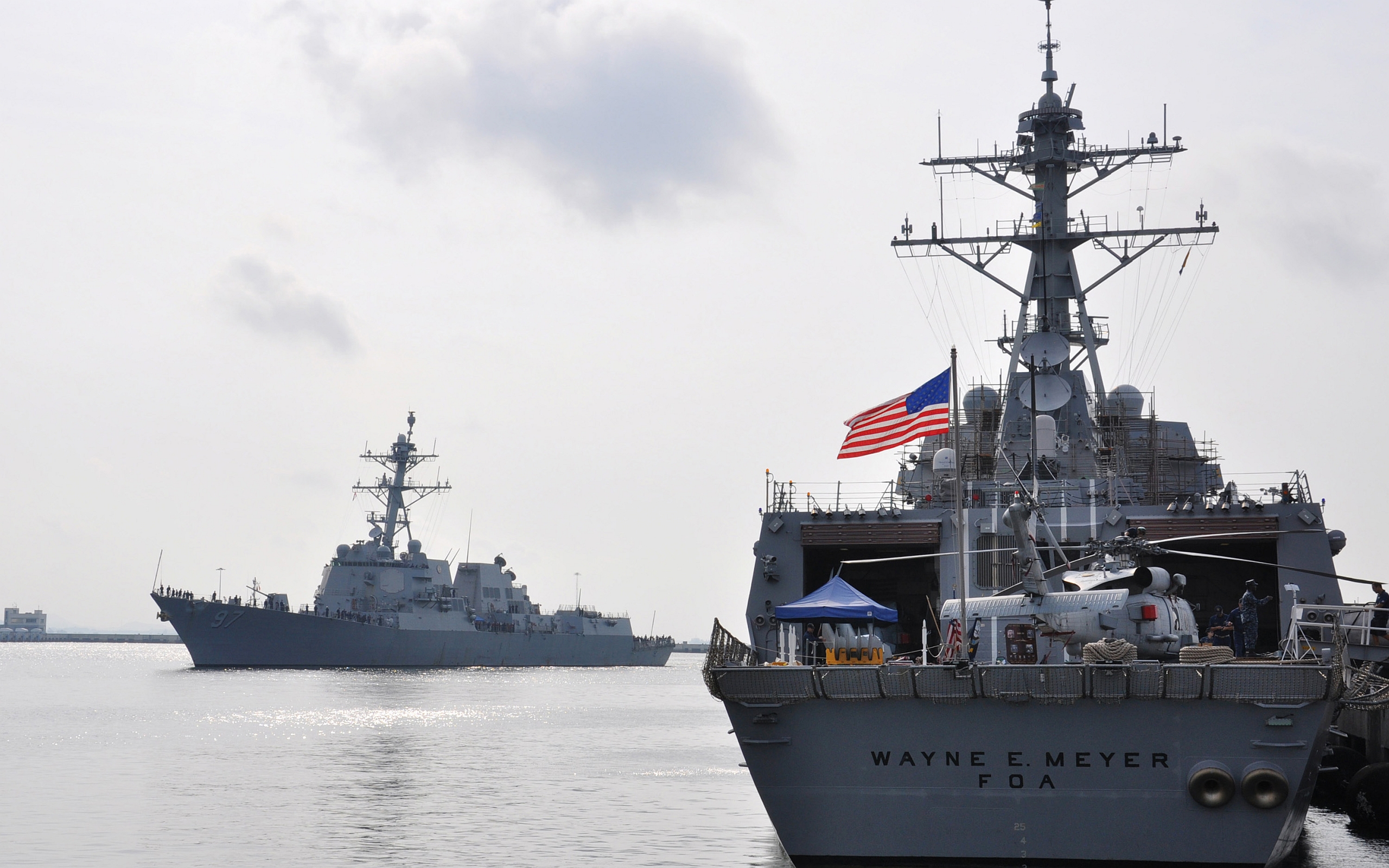 Description: A large ship and a smaller ship in the water with a flag on top of it and a flag on the side of the ship.