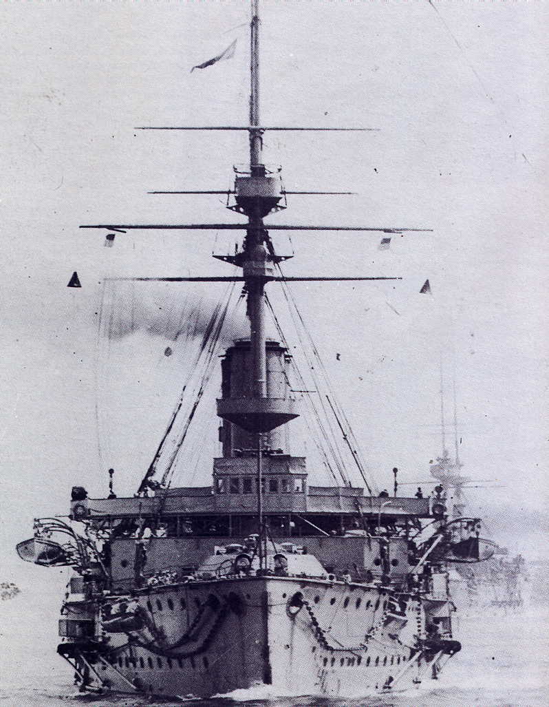 Description: A large ship in the water with a lot of smoke coming out of it's sails and a flag on top.