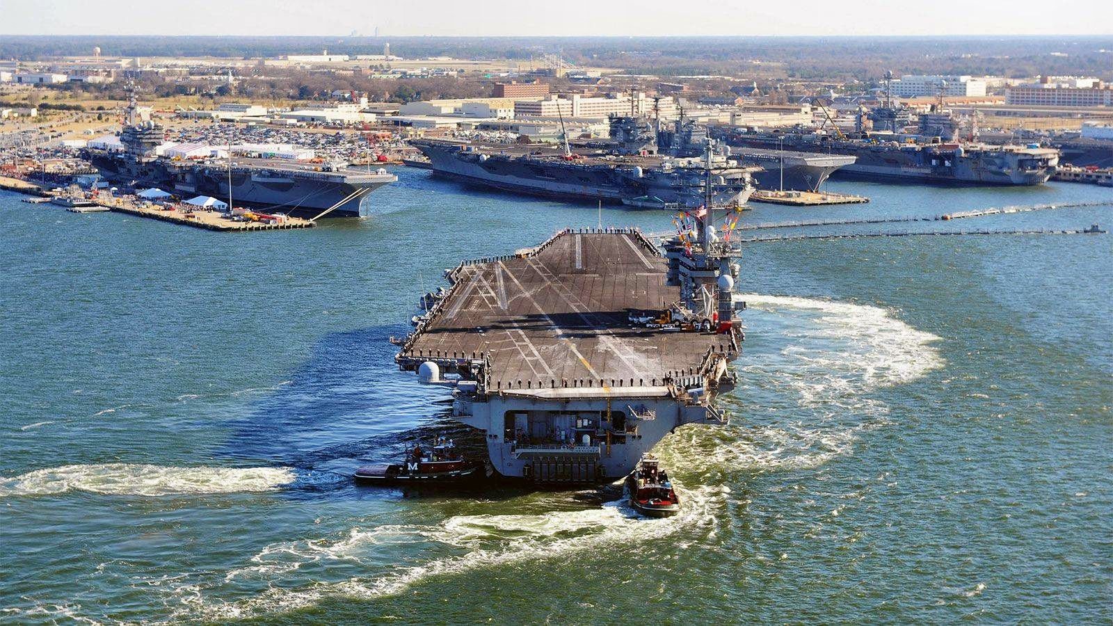 Description: A large ship in the water with a tug boat in front of it and a larger ship in the background.
