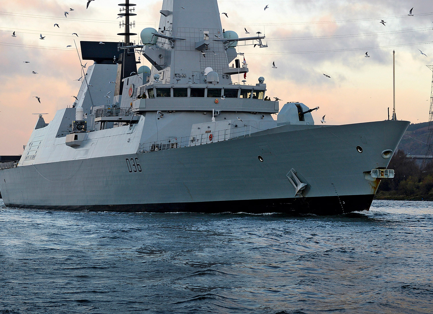 Description: A large ship in the water with birds flying around it and a sky background with clouds and birds in the sky.
