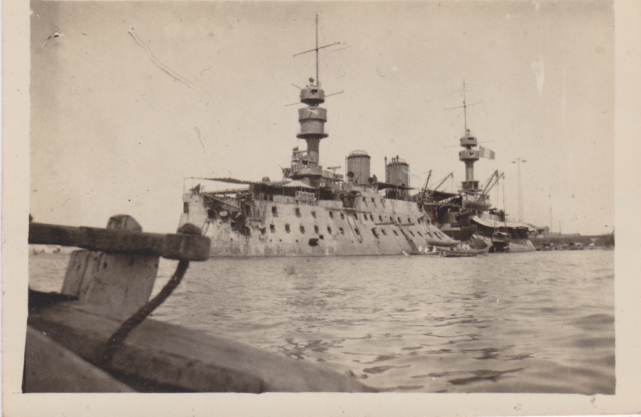 Description: A large ship in the water near a dock with a boat in the background and a smaller boat in the water.