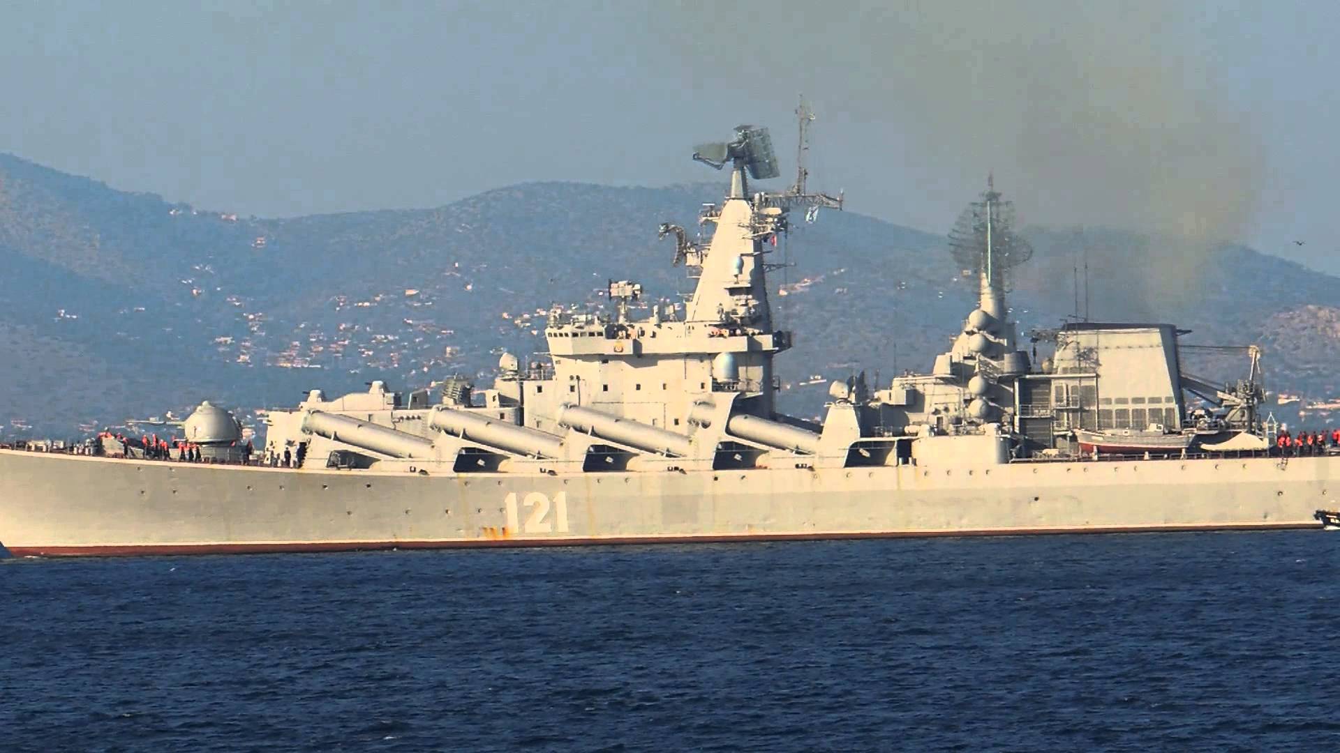 Description: A large ship floating on top of a body of water next to a mountain range in the background with smoke coming out of it.