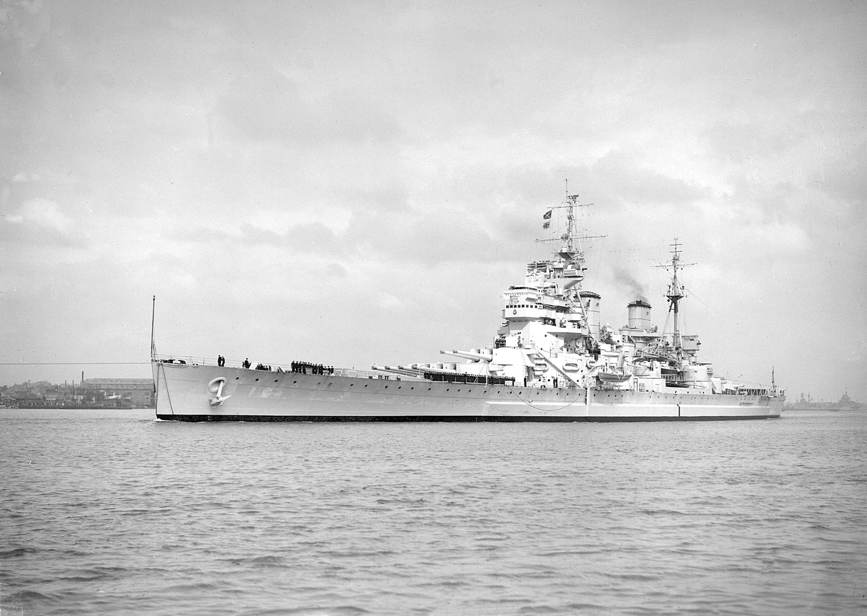 Description: A large ship floating on top of a body of water next to a shore line with a boat in the water.
