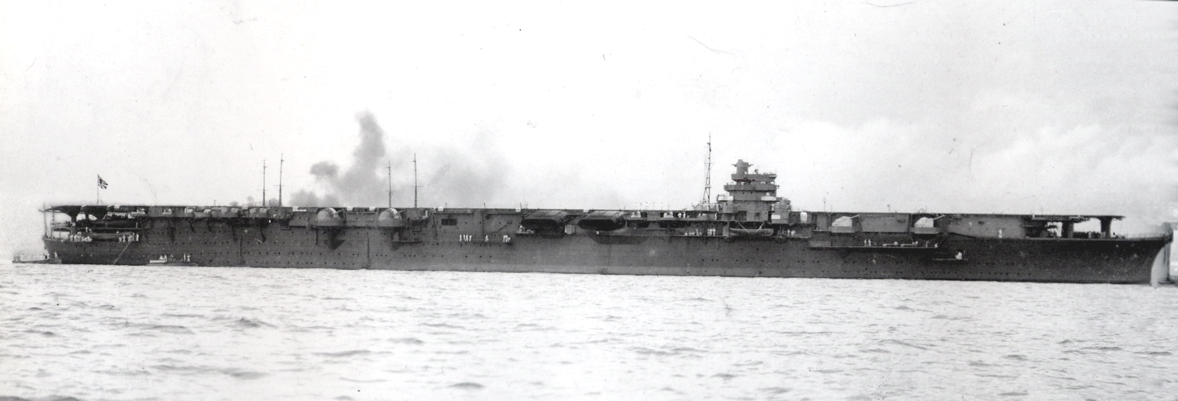 Description: A large ship in the water with smoke coming out of it's stacks and smoke coming out of the stacks.