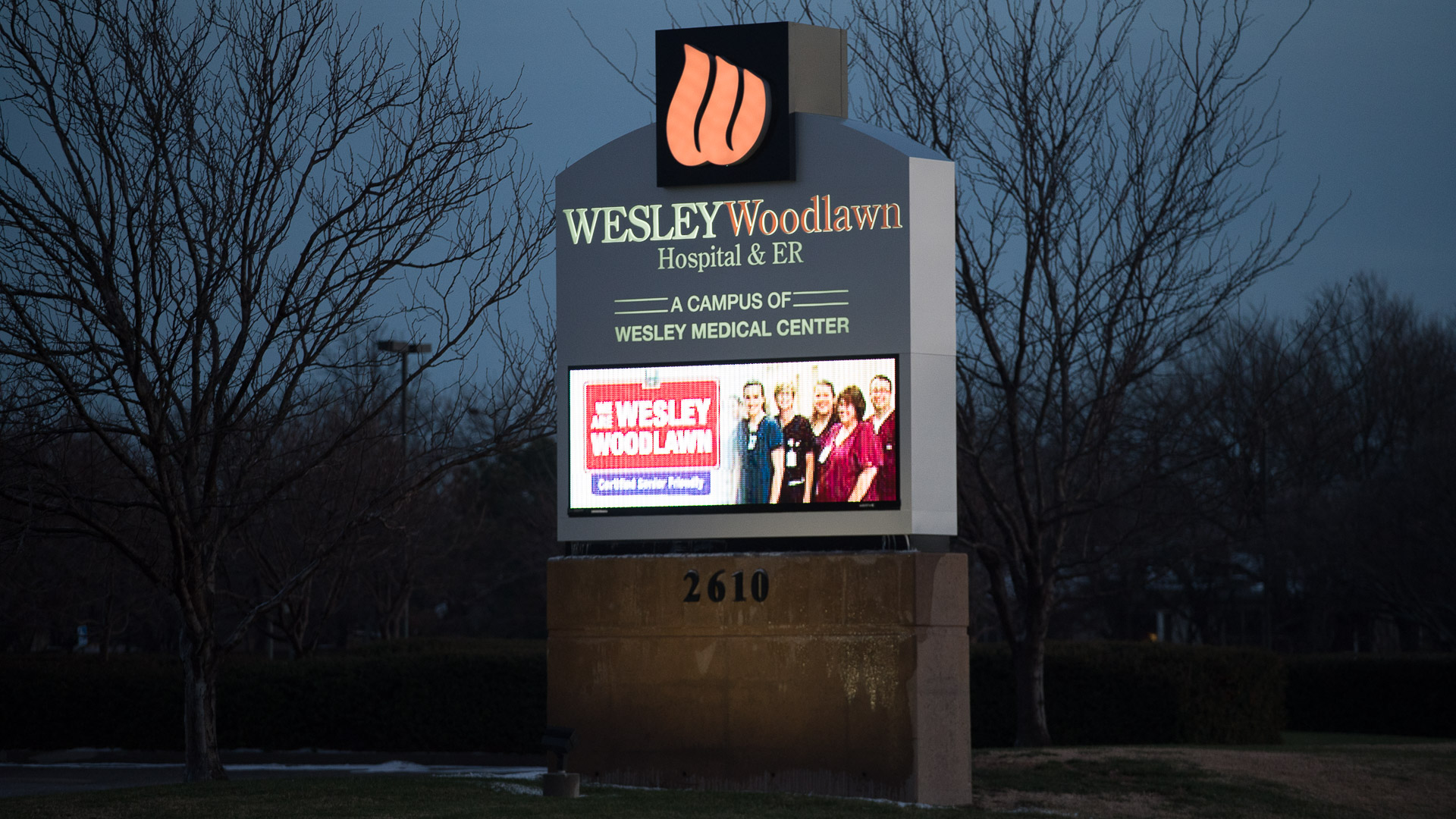 Description: A large sign with a picture of people on it in front of some trees and a building with a sky background.