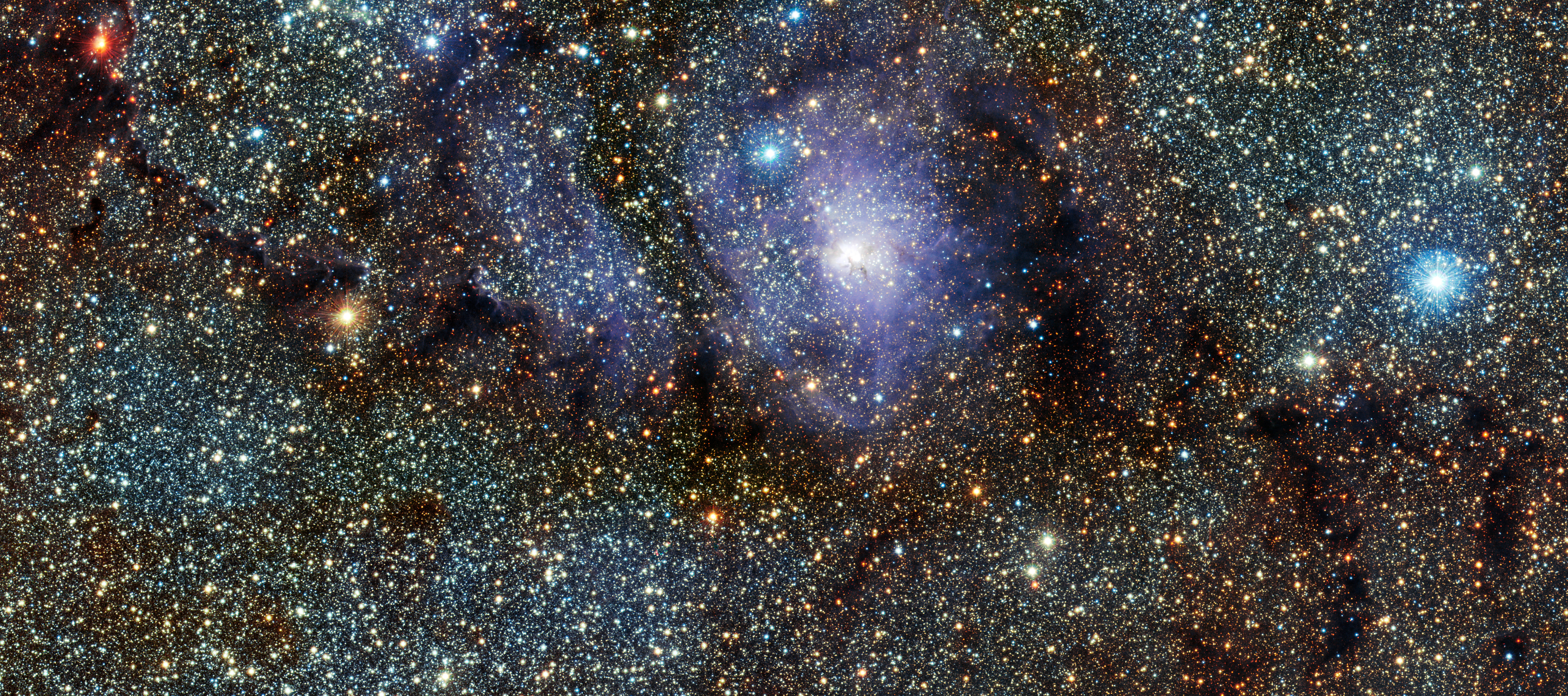 Description: A very large star cluster in the sky with many stars around it and a blue disk in the center.