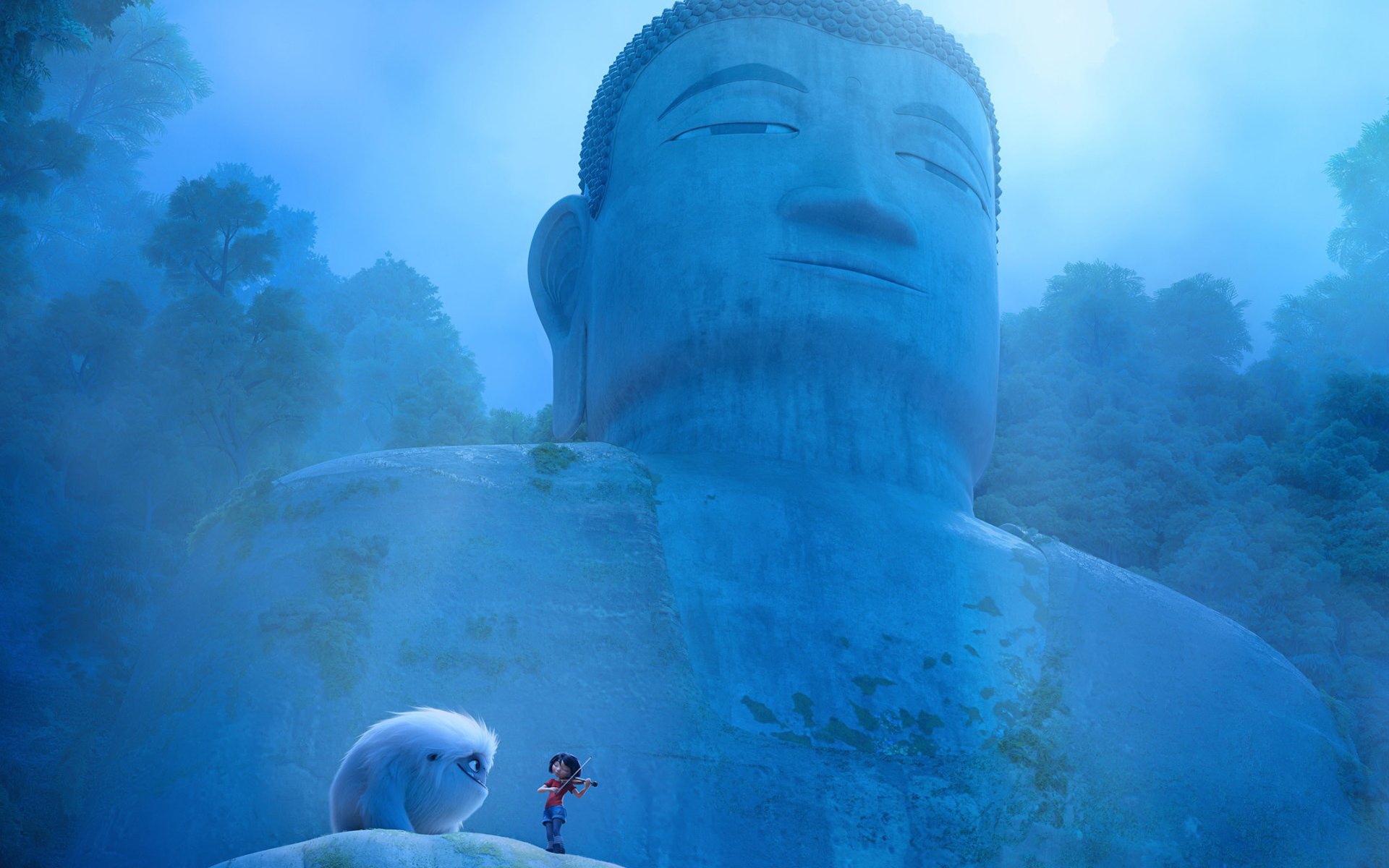 Description: A large statue with a child standing next to it in a forest with a person standing next to it.