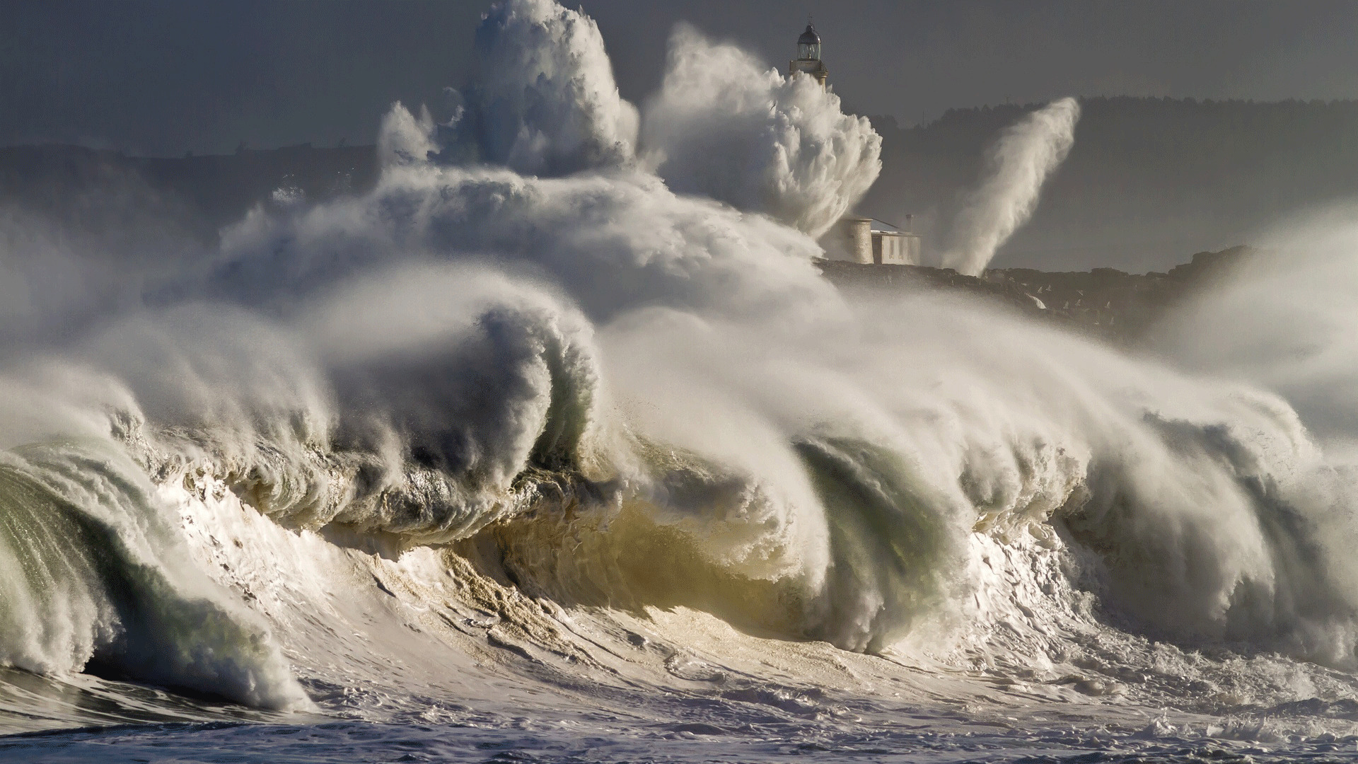 Description: A large wave crashes into the shore of a beach with a lighthouse in the background and a lighthouse in the distance.