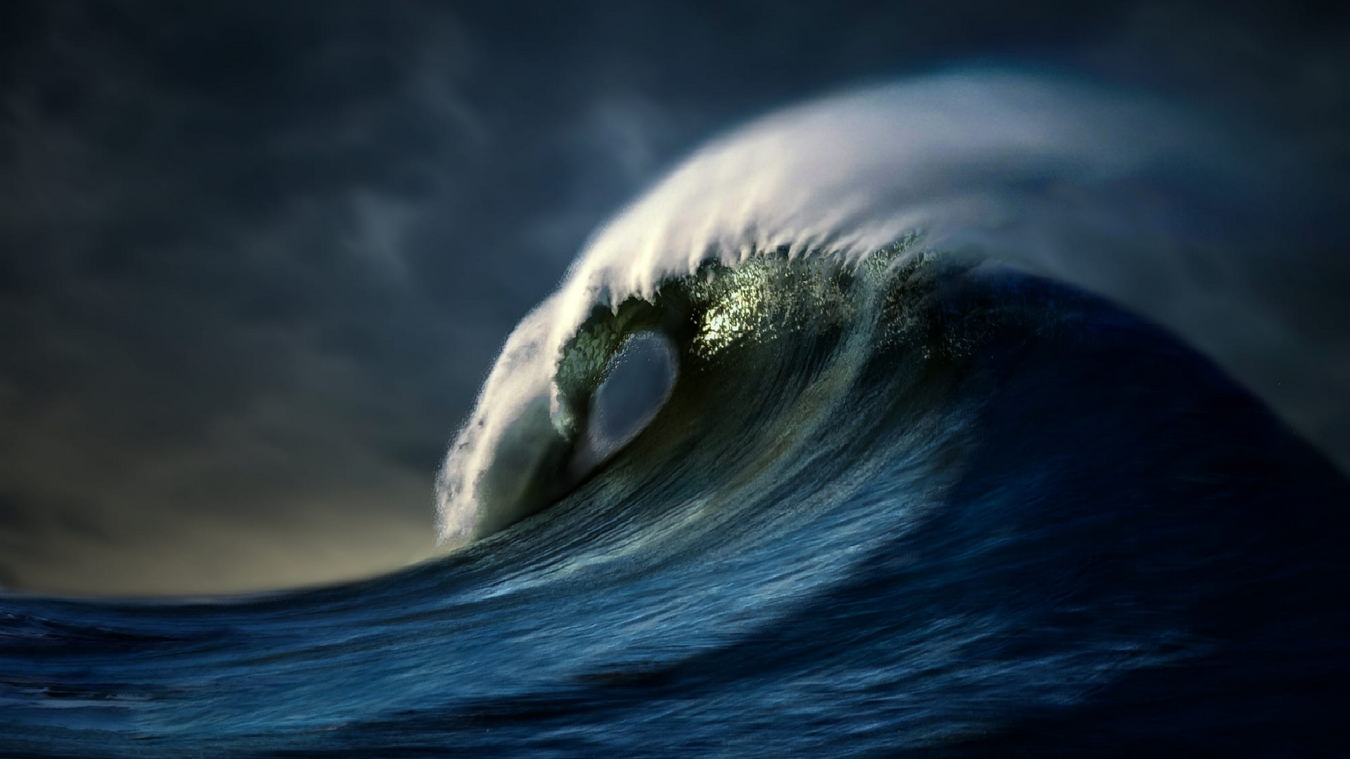 Description: A large wave is breaking in the ocean with a dark sky in the background and a white frothy substance in the foreground.
