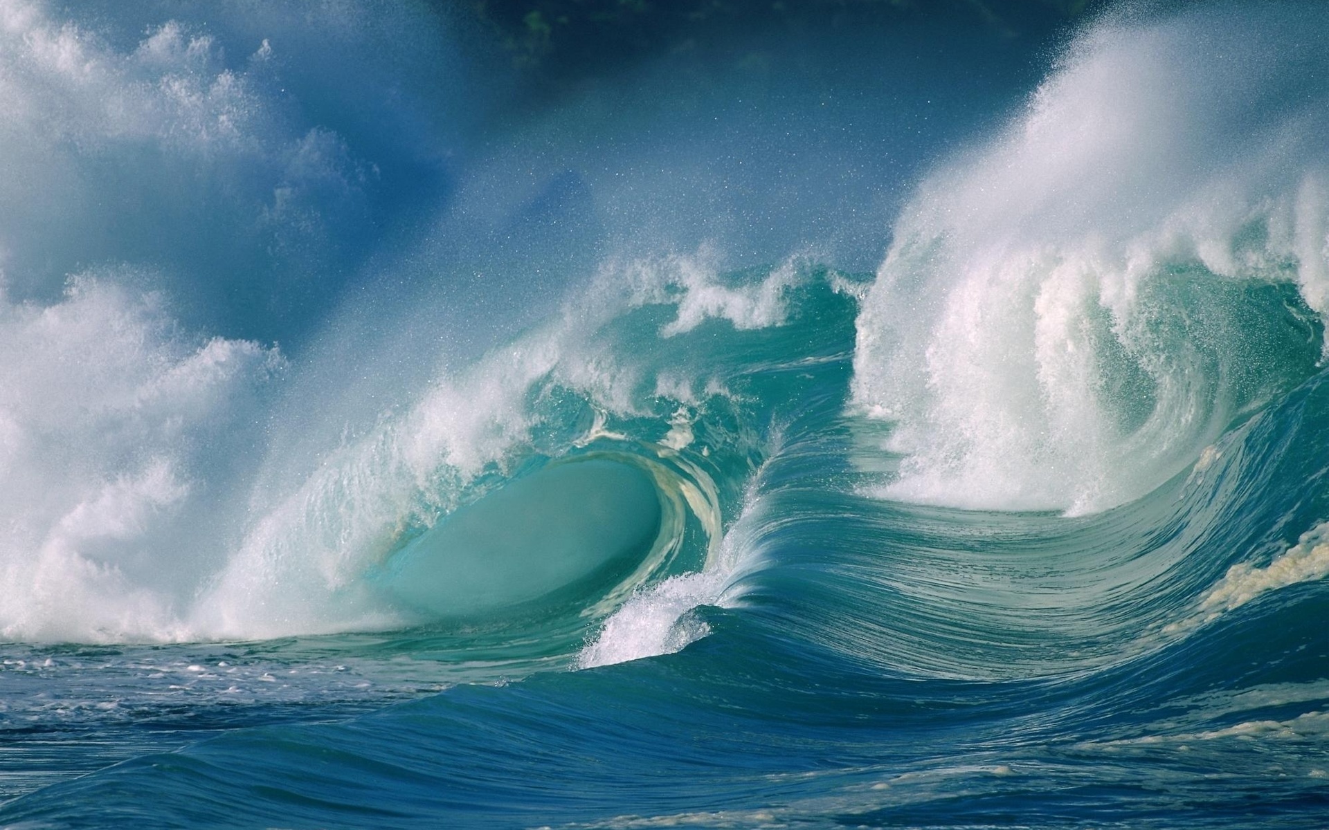 Description: A large wave is breaking over a large wave in the ocean with a blue sky and clouds above it.