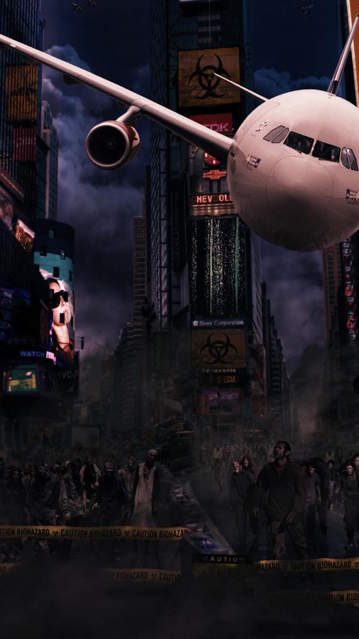 Description: A large white airplane flying over a city at night with people walking around it and a crowd of people walking around.
